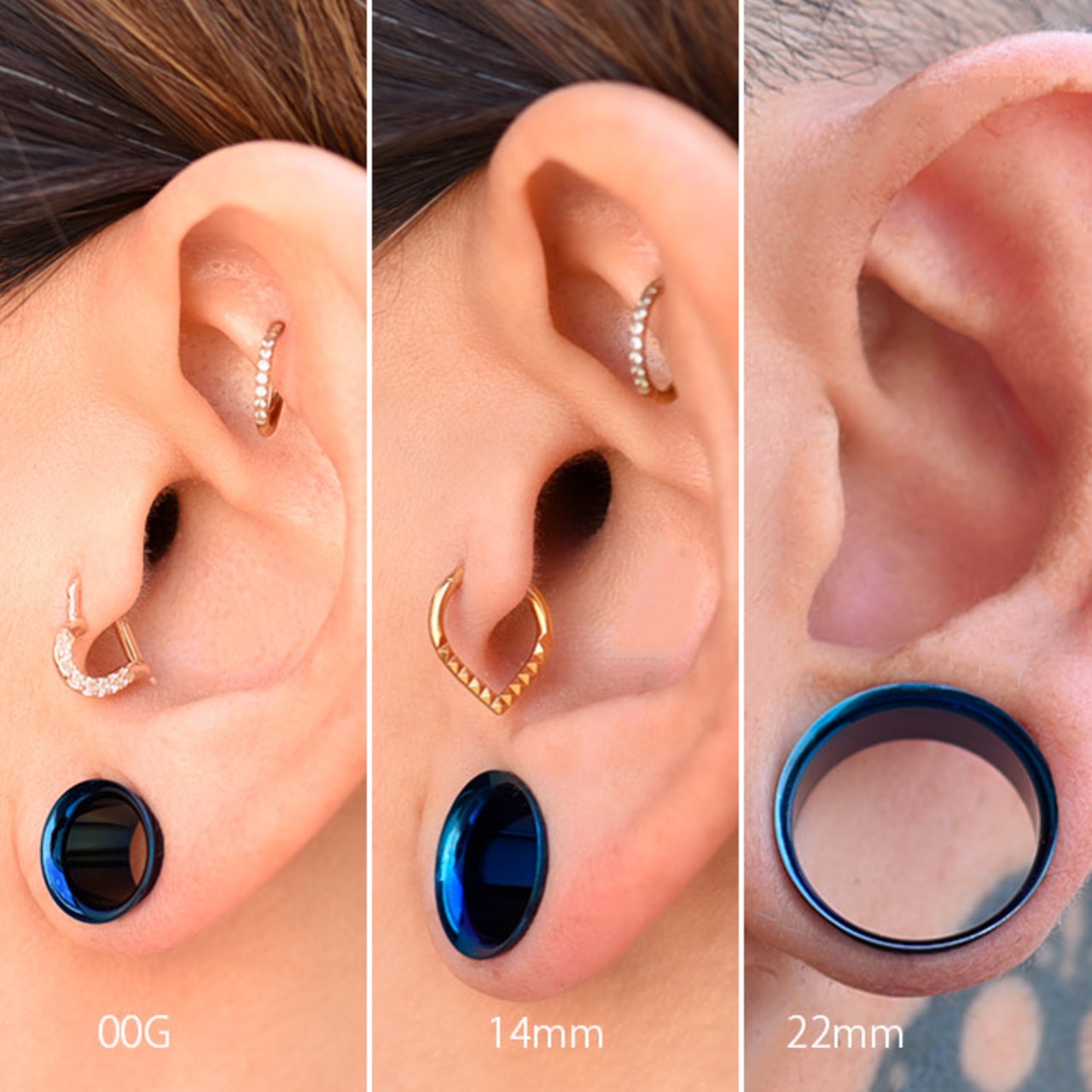 ・濃いめのブルーがかっこいいです。ピアスの繋ぎ目はなく細部まで細かく仕上げてあるのでとっても綺麗です。O-リング(ゴム)を留める凹みもありゴム外れにくく紛失しにくいのもオススメです。何といっても、どのホールサイズもシャフト&全長サイズを均一に揃えたことで見た目も統一感があります。フレアの広がりも小さめなので並べて着けてもピアス通しが重なりにくいので沢山ホールが開いている方にもオススメです。※サイズによって濃く見えたり、カラーPVDコーティングなので多少の色合いの違いがあります、ペア購入やサイズ違いで購入する場合はなるべく色味が似たブルーカラーでお出しします。