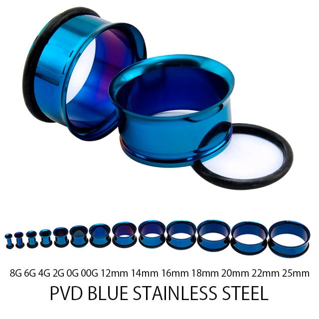 ・濃いめのブルーがかっこいいです。ピアスの繋ぎ目はなく細部まで細かく仕上げてあるのでとっても綺麗です。O-リング(ゴム)を留める凹みもありゴム外れにくく紛失しにくいのもオススメです。何といっても、どのホールサイズもシャフト&全長サイズを均一に揃えたことで見た目も統一感があります。フレアの広がりも小さめなので並べて着けてもピアス通しが重なりにくいので沢山ホールが開いている方にもオススメです。※サイズによって濃く見えたり、カラーPVDコーティングなので多少の色合いの違いがあります、ペア購入やサイズ違いで購入する場合はなるべく色味が似たブルーカラーでお出しします。