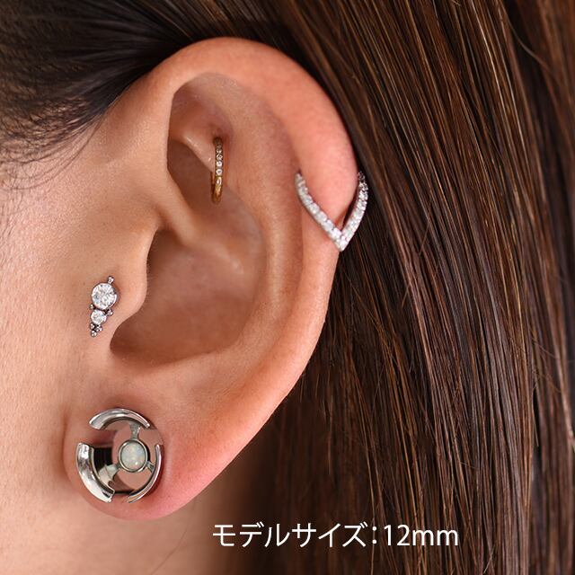 ・フロントデザインは、3カ所隙間がありデザイン性ある仕上がりです(裏面は繋がってます)。真ん中には神秘的なホワイトオパール色がアクセントになってオシャレ。ダブルフレアピアスなのでフレアサイズが約1.8mmほど大きいです、ホールに隙間がない方や伸びにくい方はワンサイズ下のピアスをお勧めします。※耳の装着画像ピアスはサイズ12mmです、参考にして下さい。