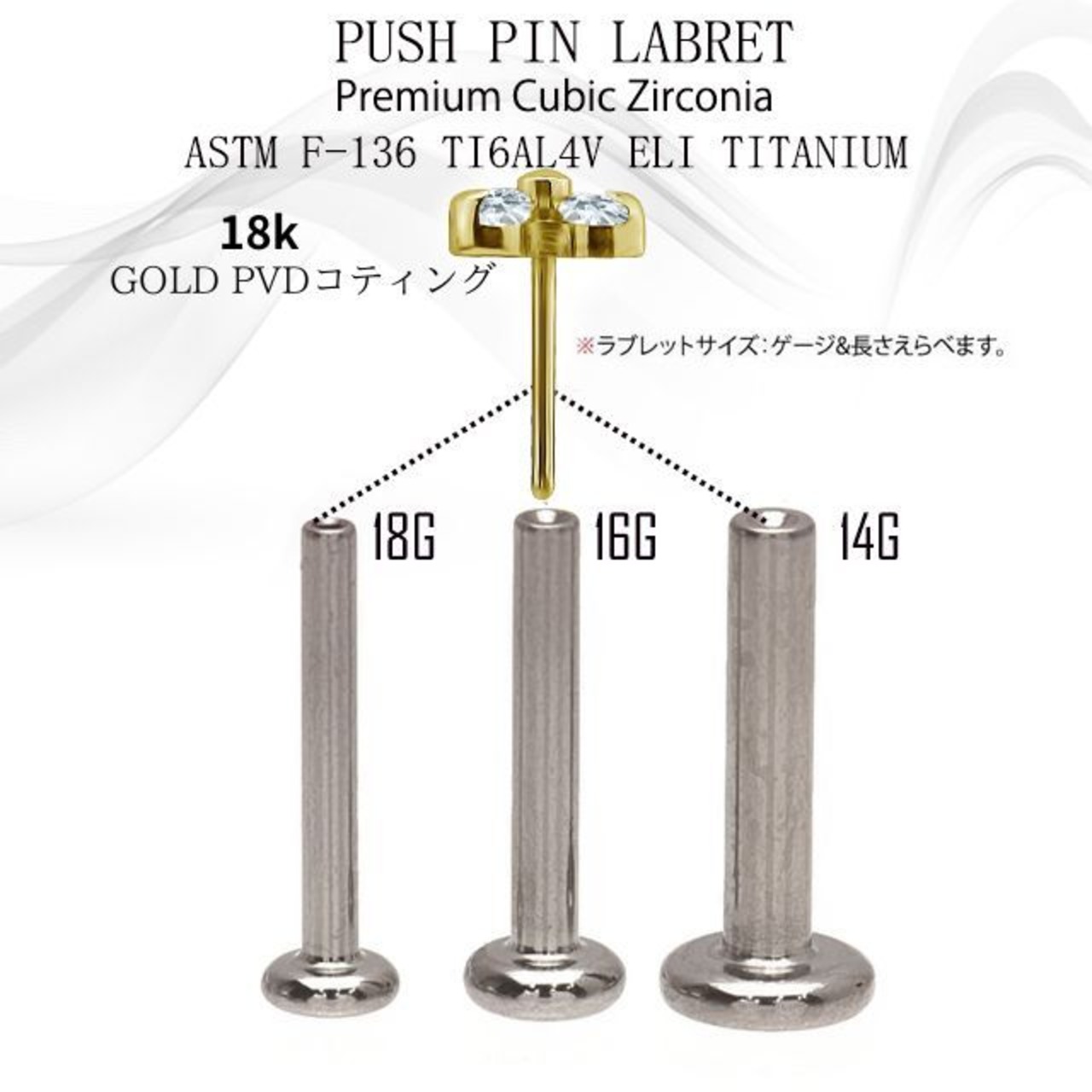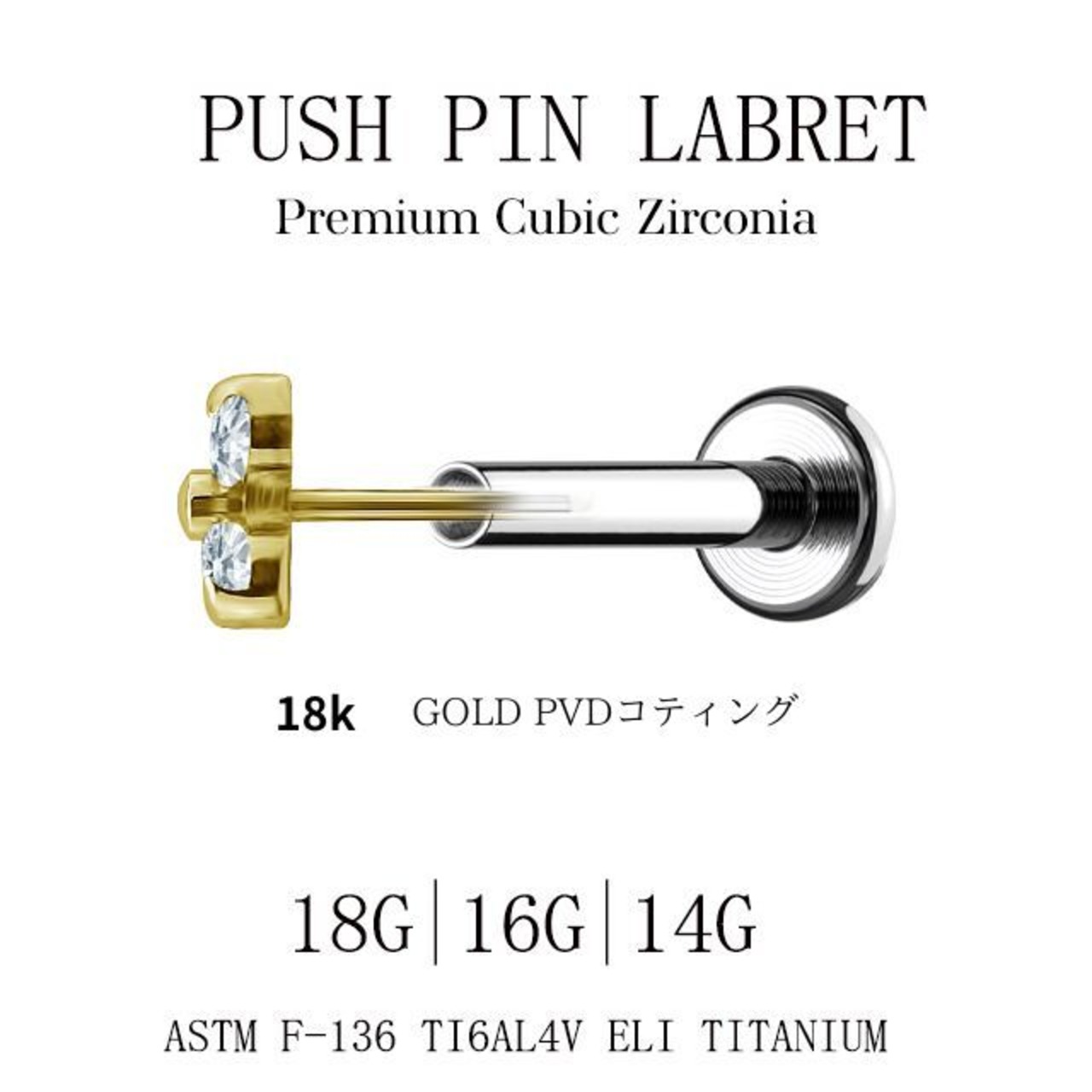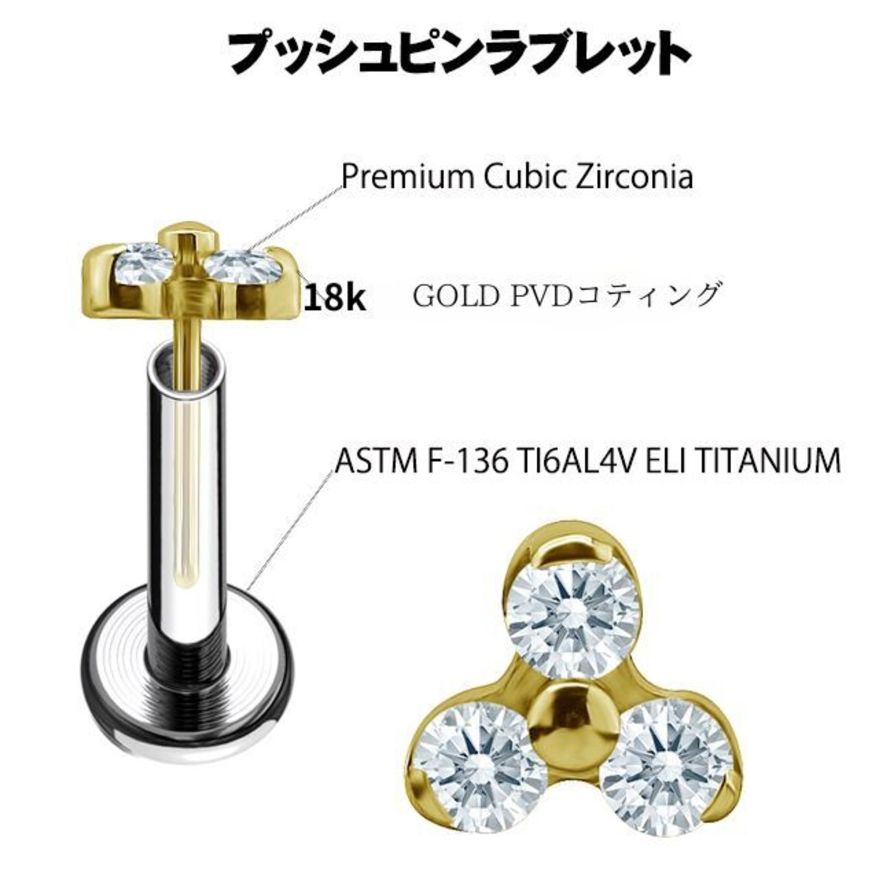 挿すだけ装着 プッシュピアス 18G 16G 14G 18金PVDコーティング ゴールド トリニティ プレミアムジルコニア チタンピアス 金属アレルギー対応 ラブレットスタッズ ボディピアス