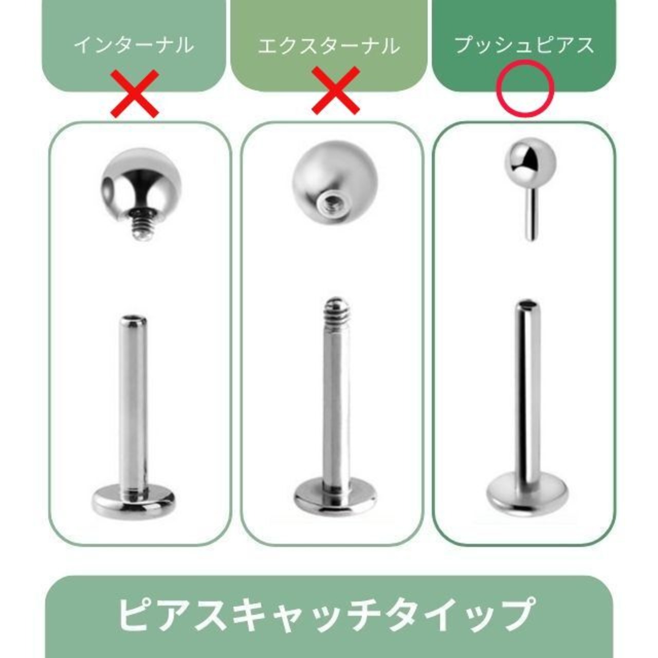 何と言っても装着が挿すだけの簡単プッシュピンタイプなのでネイルされている方や不器用な方にもオススメです。チタン素材なのでお肌にも優しく金属アレルギーの方でも比較的安心して使えます。※たまにキャッチが緩くなったら画像のように調節して下さい。別売りのツールがあると入れにくい部位や不器用な方でもホールにスムーズに入れることが出来るので1個は持っていてほしいアイテムです。