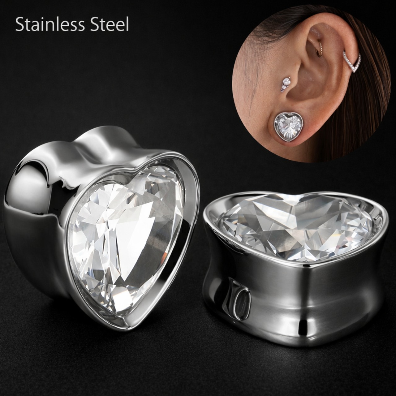 ボディピアス 0G 00G クリスタル ジルコニア ハート ダブルフレア ラージゲージ 拡張ピアス ステンレスピアス トンネルピアス