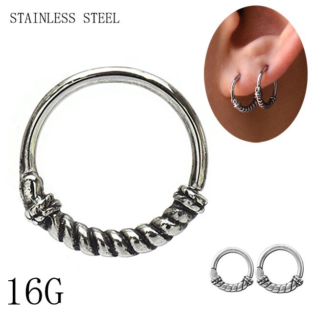 ワンタッチピアス 16G リングピアス ボディピアス ロープデザイン ツイスト 簡単装着 クリッカーピアス ロブ へリックス セプタム 軟骨ピアス ステンレスピアス | BONshape ボディピアス専門店