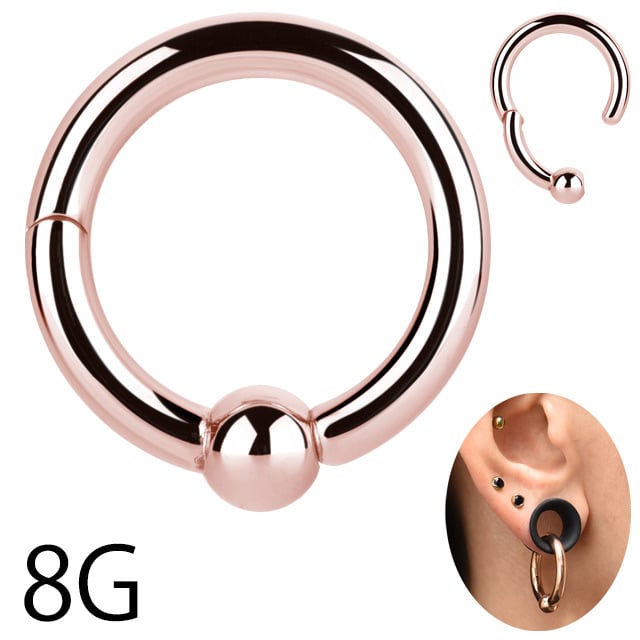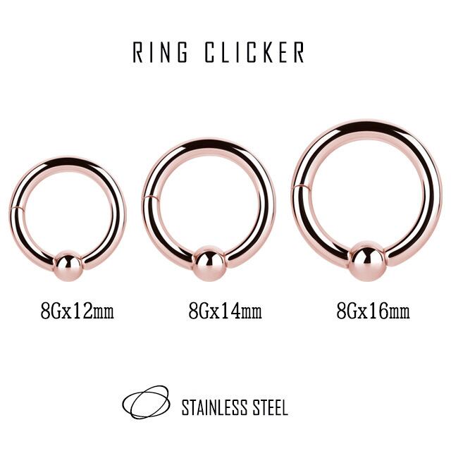 ・人気のピンクゴールドカラーです!道具なしでも簡単に着けれるセグメントリングピアスは、CBRの形でボールもくっついているので無くすことなく安心して使えます。シンプルだから人気あるけど硬そう、道具も要るからと敬遠されていましたがコレならカチッと手で開いたり閉じたり出来るのでストレスなく使用出来ますよ♪内径サイズも選べるのでロブ、へリックス、セプタム、リップ、ニップル、へそピアス等々いろんな部位に装着できるので重宝しそうです。※耳の装着画像は8Gの内径16mmです。