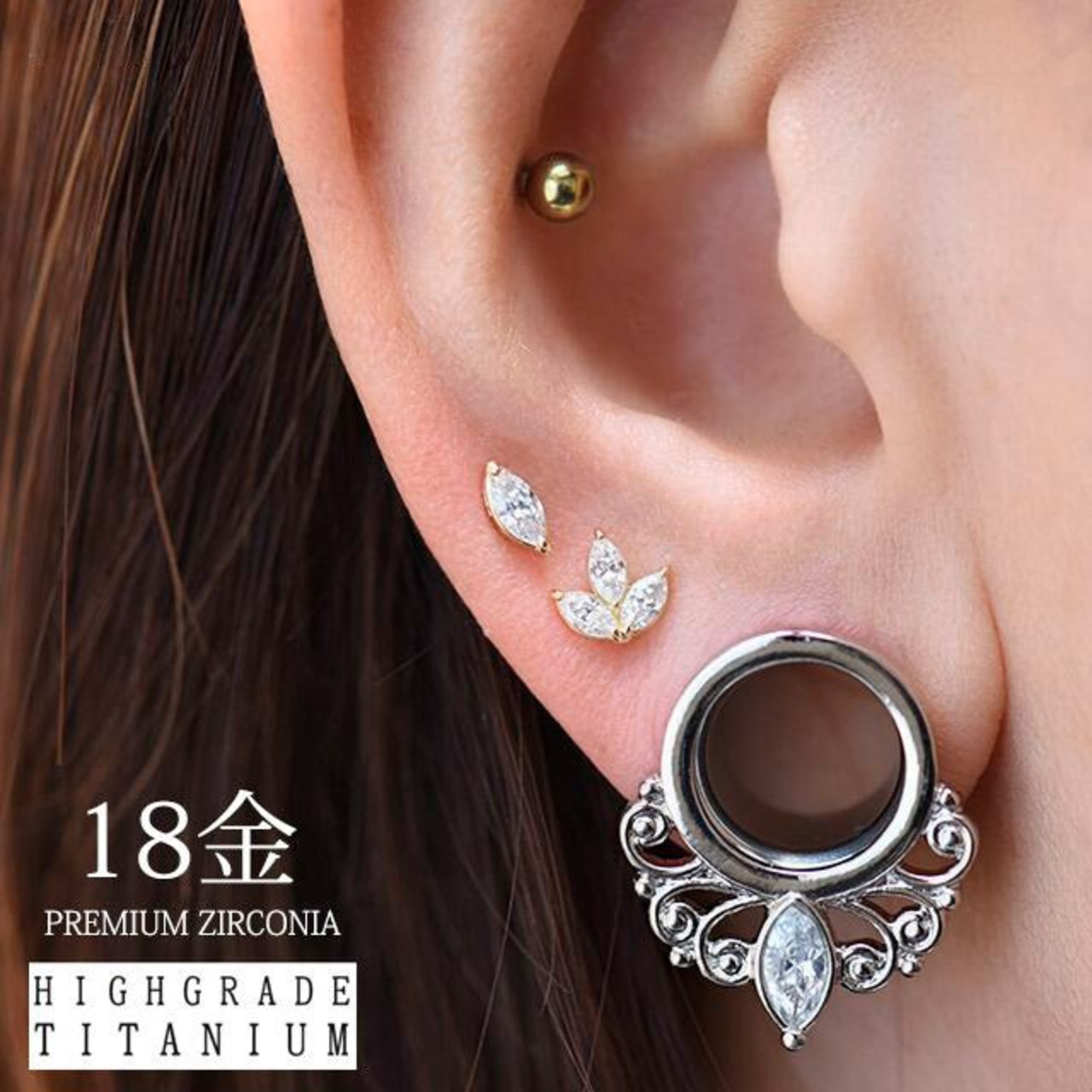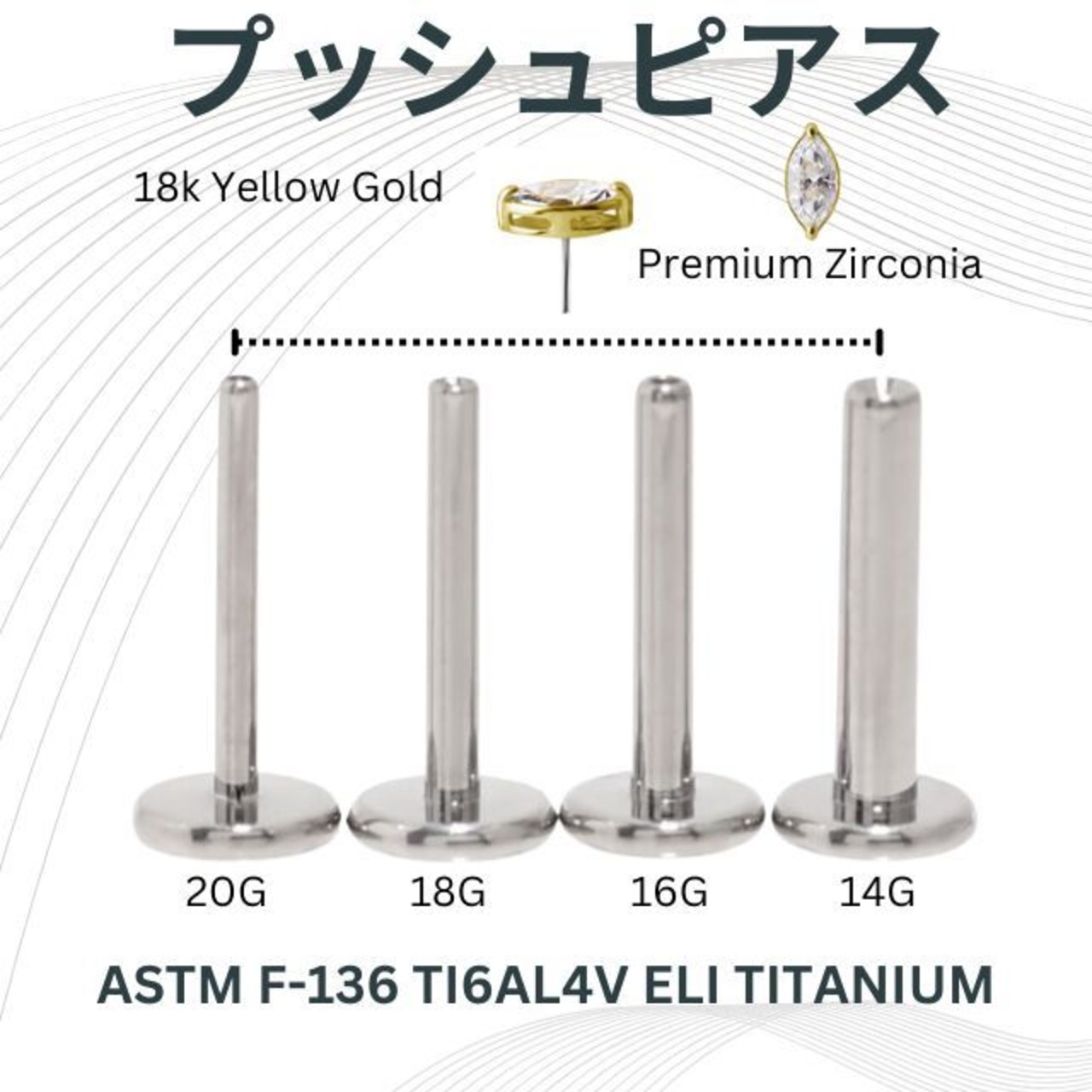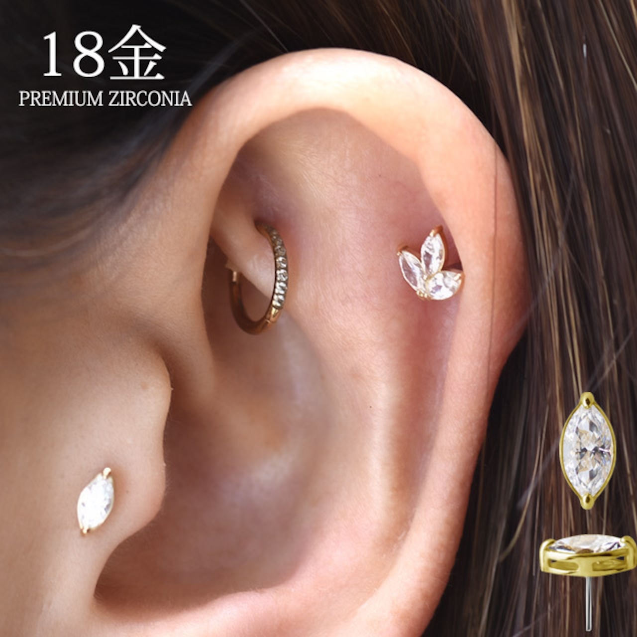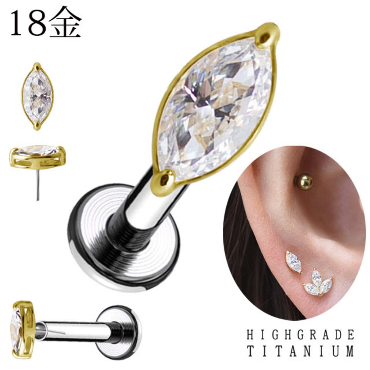 18K 18金ゴールド 挿すだけ装着 プッシュピアス 20G 18G 16G 14G Marquise マーキス プレミアムジルコニア チタンピアス 金属アレルギー対応 ラブレットスタッズ ボディピアス ロブ 軟骨ピアス