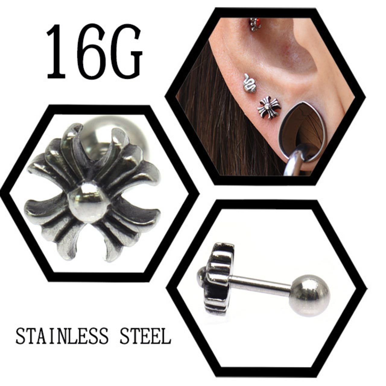 ・かっこいいクロスデザイン。いぶし加工風でよりオシャレです。 ロブやヘリックス、インナーコンク、アウターコンクなど軟骨ピアスにまた舌ピアスにもオススメです。 長さも選べるので着けたい部位の長さでお選びください。 ※ロブや軟骨の平均サイズは4mm~6mm、舌ピアスは12mm~14mmです。あくまでも平均サイズなのでご自分の部位の厚みで参考にして下さい。