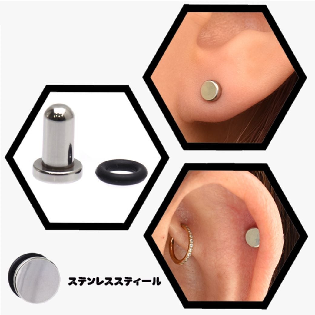 ・簡単ゴムピアスは、さっと着けれて0-リング(ゴム)を留める部分はくぼみがないのでご自分の好きな位置でゴムを留める事ができます。 シンプルなプラグピアスなので他のピアスとも合わせやすいですよ。
