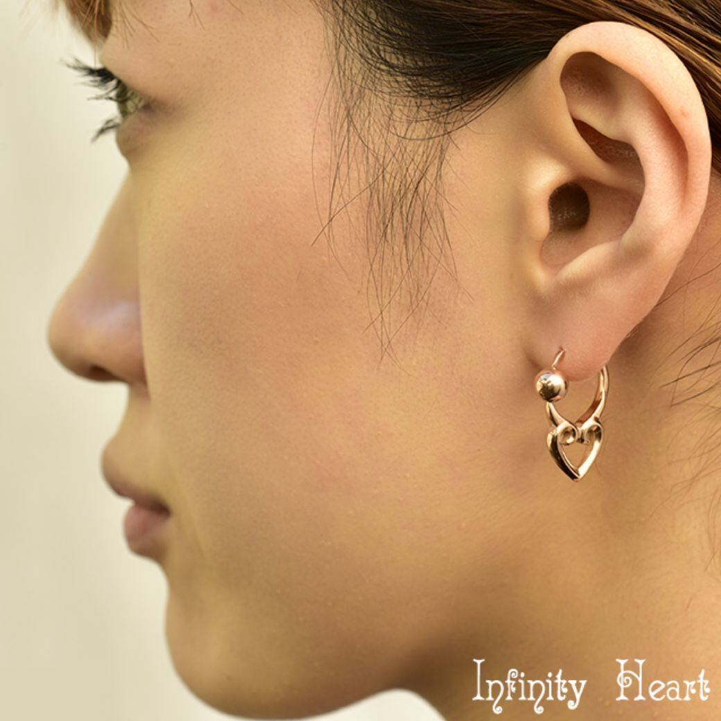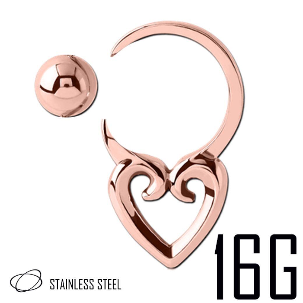 ・ハートの形がリングと一体型になったオシャレなピアスです。ハートの形もかっこよくデザインされ、トライバルのようにも見えます。ピンクゴールドカラーなので可愛く決まります。キャッチのボールサイズも6mmと大きめなので着脱も楽です。そんな存在感あるオシャレなピアスは、ロブやへリックスなどの部位に使えます。