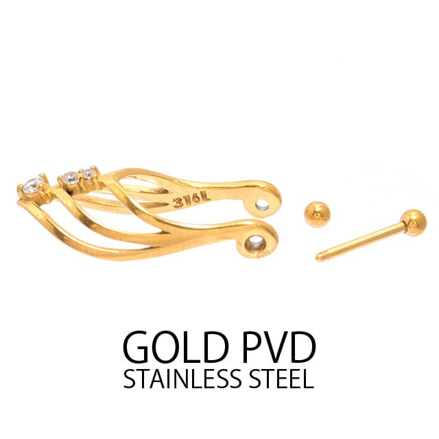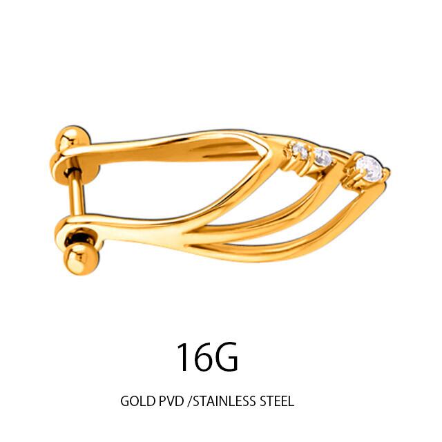 ・耳のヘリを添うように身につくオシャレなピアスは、ゴールドカラーで高級感があります。クリスタルジルコニアが3個も付いているので動く度に輝き、とても綺麗です。 へリックスの軟骨ピアスや横から見た時にも立体感があるのでロブにもオススメです。