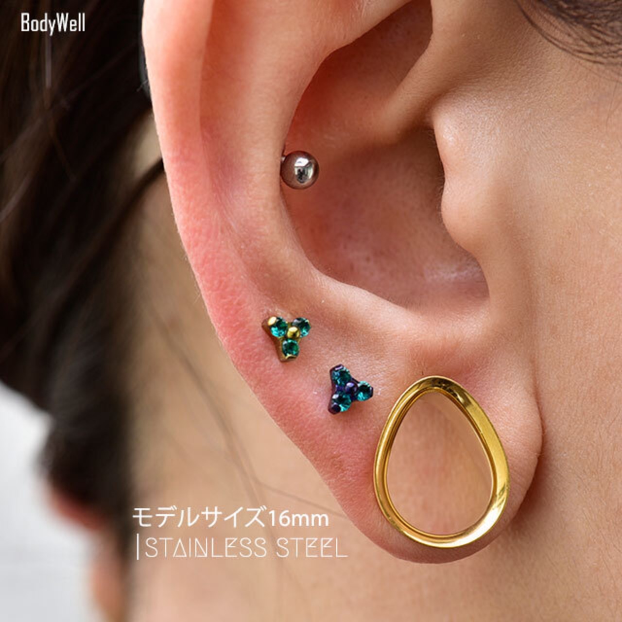 ・ティアドロップの形がすごくオシャレ。ゴールドピアスなので存在感が増します。シンプルなので他のピアスとも合わせやすく使いやすいです。フレアピアスですが丸ではないので普通のダブルフレアよりも入りやすいです。安いので1個は持っていても損はないですよ。※耳の装着画像ピアスはサイズ16mmです。