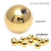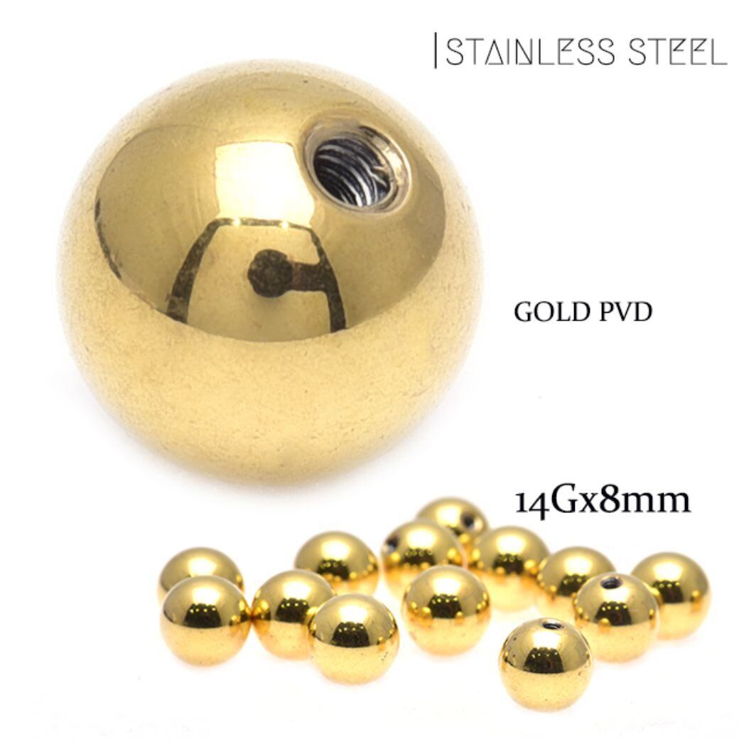 ・ボールのパーツのみの販売です。黄金に輝くゴールドボールがとっても綺麗です。なんとボールサイズも8mmなので存在感あり!14Gのバーベルさえあれば、ボールを付け替えるだけでイメチェンできますよ。(たまにネジが合わないメーカーあり)カラーピアスを取り入れることでグッとオシャレに決まります。エクスターナルネジです。