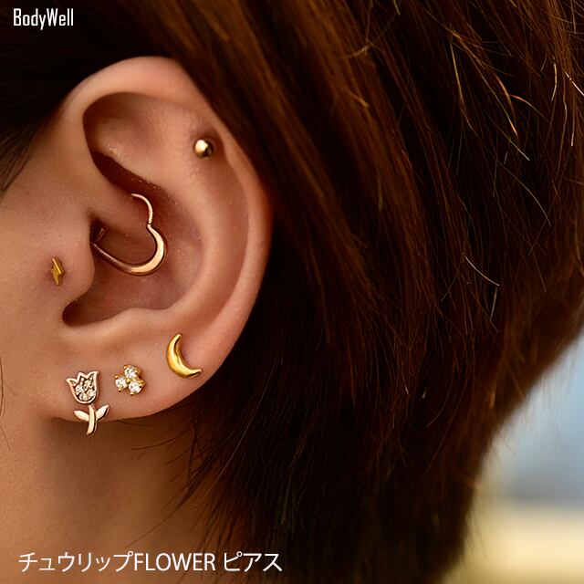 ・可愛いチューリップデザインです。ピンクゴールドとストーンが女子力UPですよ。ロブやヘリックス、インナーコンクなど軟骨ピアスなどにもオススメです。