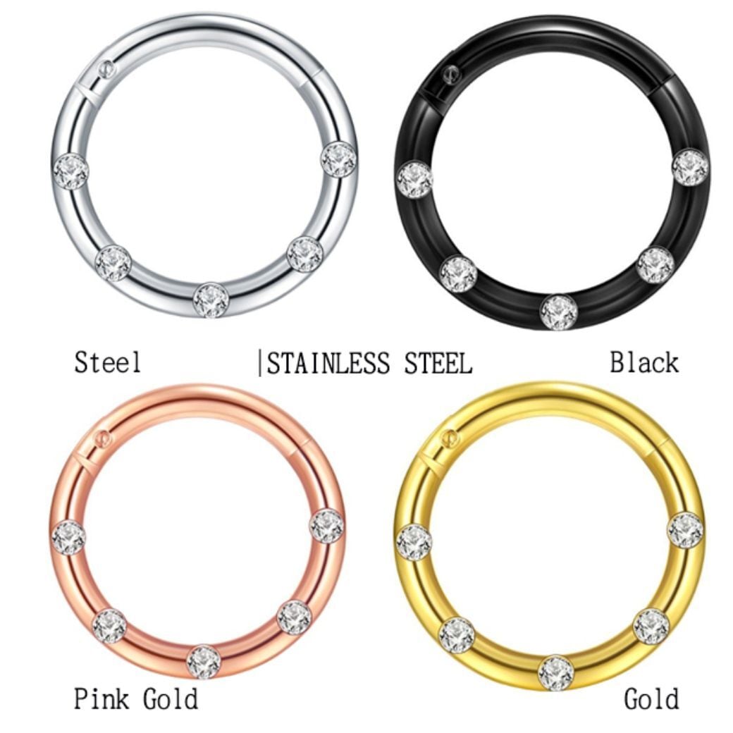 ・カラバリ豊富な4色から選べます。内径サイズも4サイズあるのでロブ、へリックス、トラガス、インナーコンク、ロック、ダイスなどいろんな部位に着けれますょ。小さめストーンがどれも5個付いていてリングにさりげなく付いているので派手になりすぎず普段使いにも使いやすいです。 カチッとワンタッチで手で開いたり閉じたり出来るのでキャッチを無くすことなく簡単に着けれますょ。※装着画像は14Gサイズです、16Gは、もう少し細いのでイメージ画像としてご覧下さい。