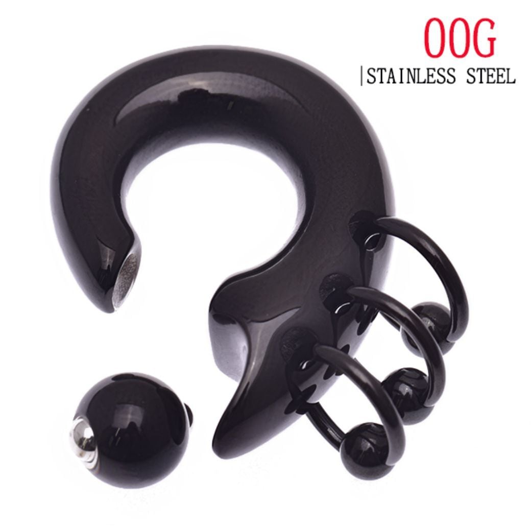・人気の3連リングブラックカラー誕生!他の店には無いデザインリングが付いている3つのキャプティブは、本物なので、付け外しも出来、1つのピアスがな・ん・と4つに!トンネルに通してホールトゥーして使うとさらにインパクトあって、カッコイイですよ!よりハードに決めたい方にはブラックなトンネルにブラック3連リングがオススメです。キャッチは、両サイドに小さいバネボール付きのスプリングボールなのでゲージサイズが太くても簡単に着けれますよ。※00Gは太さが10mmですが少し小さめです、あらかじめご了承下さい。