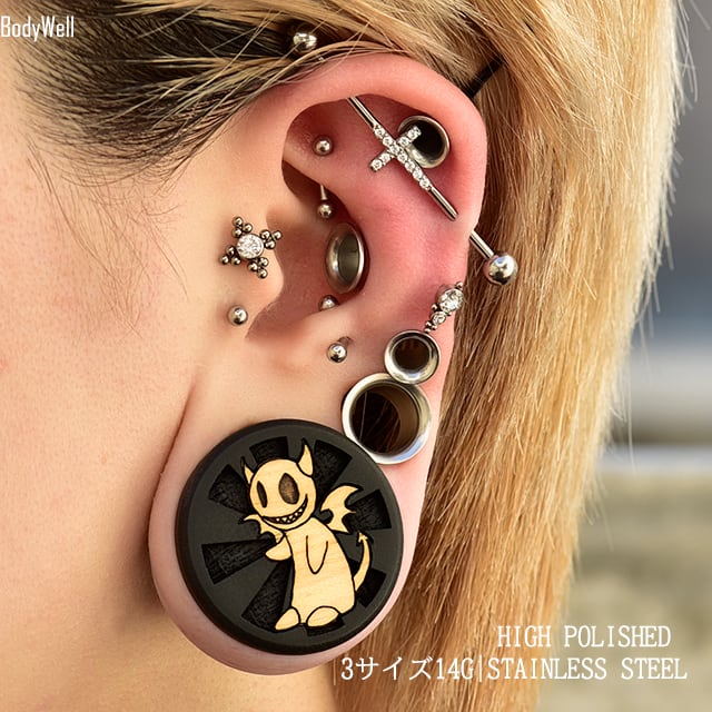 ・キラキラとジルコニアが輝く、華奢なクロスデザインが大人っぽく上品に決まりますよ。接着剤を使用しないプロングタイプなのでお肌に優しいです。ハイポリッシュ仕上げで磨きが綺麗で高級感があります。ハードになりがちなインダストリアルもコレならパーティーシーンなどにもおすすめです。