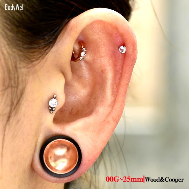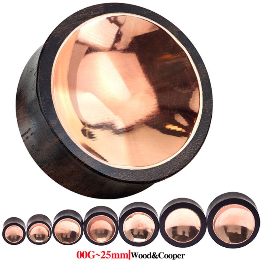 ・ブラウンウッドに銅素材のデザインが輝き高級感ある仕上がりです。銅の部分は丸みがあってくぼんでいるので光沢があって綺麗です。※ハンドメイドで仕上げており、銅がウッドに少しはみ出ていたり、銅自体に小さい黒い点や多少の傷がある場合がありますが工程上しょうがなく、あらかじめご了承下さい。※フレアピアスなのでフレア部分がゲージサイズより約1mm~1.5mm程大きいです。ホールに少し余裕がある方なら入りやすいですが心配な方はワンゲージ下のサイズをオススメします。※耳の装着画像は14mmです。