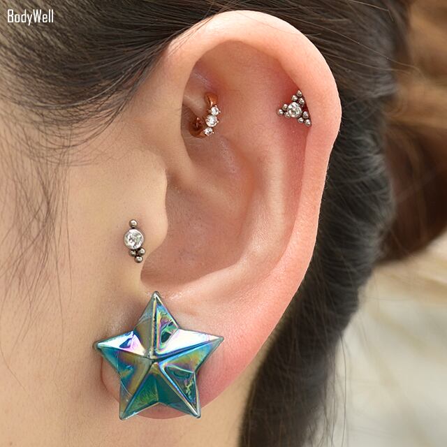 ・人気モチーフ星デザインがガラス素材で登場!ガラス独特の透明度がとっても綺麗ですよ。※フレアピアスなのでフレア部分がゲージサイズより約1.5mm~2mm程大きいです。ホールに少し余裕がある方なら入りやすいですが心配な方はワンゲージ下のサイズをオススメします。※耳の装着画像は14mmです。