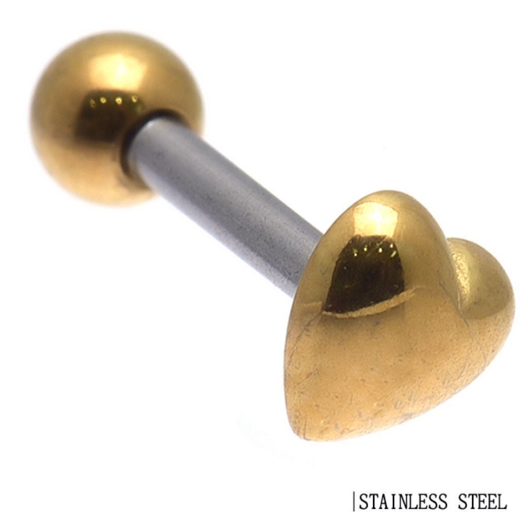 ・ぷっくりとしたハートがとてもキュート♪ゴールドカラーで高級感があります。ホールに入るシャフト部分はステンレス素材なのでお肌に優しいですよ。シャフトの長さが選べるので耳たぶや軟骨、舌ピアスなどいろいろな部位におすすめです。※ロブや軟骨の平均シャフトサイズは5mm~6mm、舌ピアスの平均サイズは12mm~14mmです。部位の厚みで長さをお選び下さい。あくまでも平均サイズなので参考にして下さい。