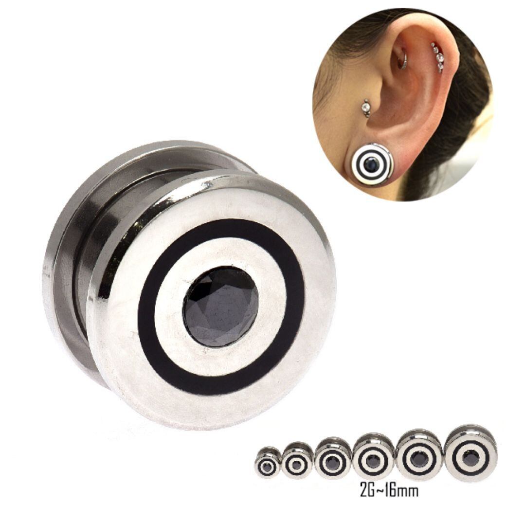 ・シルバー×ブラックカラーのサークルデザインが格好良い!中心にはブラックジルコニアがさりげなく輝き、アクセントになってお洒落ですよ♪ALLステンレス素材でお肌に優しいです。※耳の装着画像ピアスは2G/14mmです。