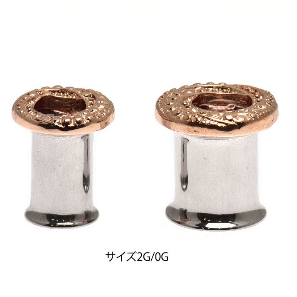 ・らせん状のサークルデザインがお洒落でラージホールを上品に見せてくれますよ。優しい色合いで上品なピンクゴールドカラーと華やかで高級感のあるゴールドカラーから選べます。パーティーシーンなどにもおすすめです。※装着する時のフレア部分が1mmくらい大きいです。ホールが伸びにくい方は1ゲージ小さいサイズをお選び下さい。 ※耳の装着画像ピアスは2Gです。