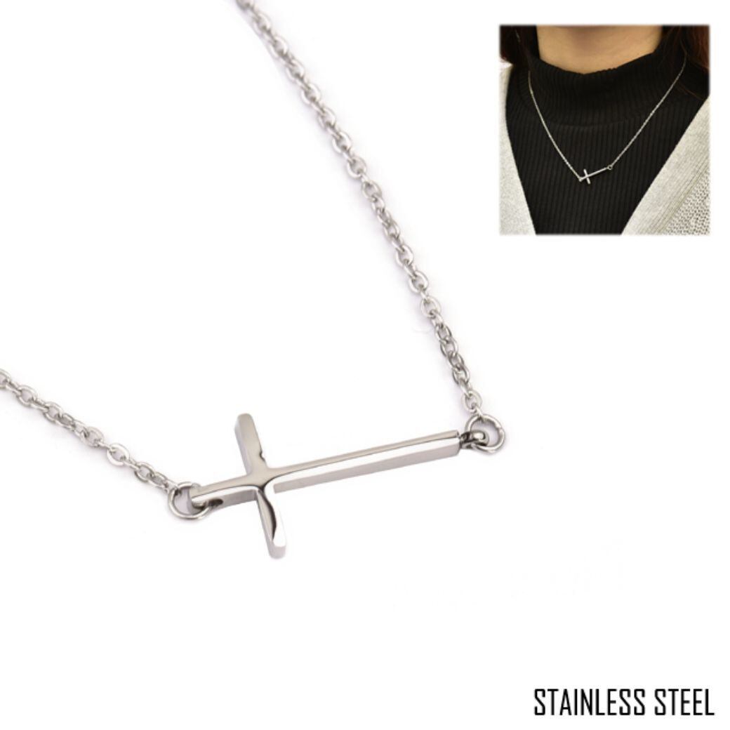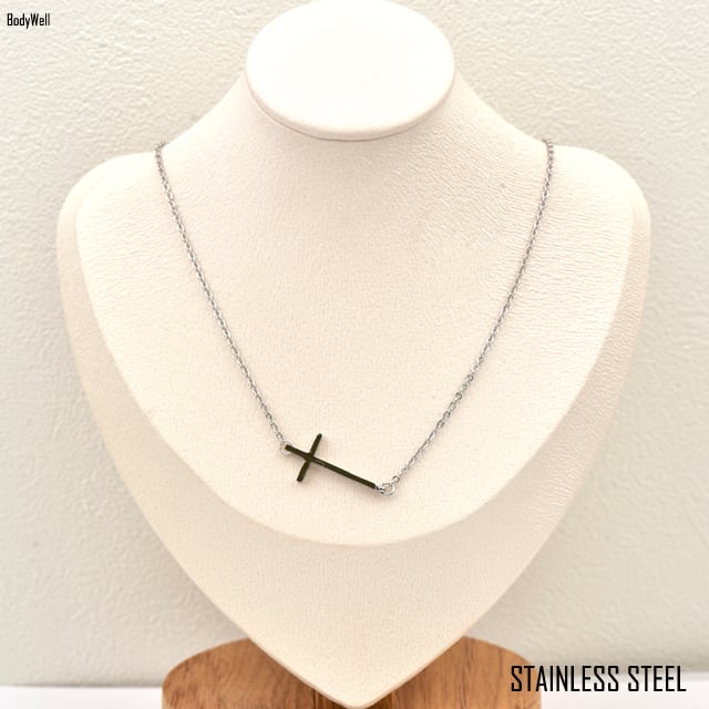 ・縦ではなく横のラインになっているのがひと味あって魅力的な仕上がりになっています。シンプルで洗練された雰囲気のクロスネックレスは、オシャレ♪ 金属アレルギーの方にも優しいサージカルステンレスは、JIS規格で「316L」と呼ばれ、アレルギー性が低い素材となっております。医療用工具のメスやハサミ、ボディピアスにも使用されている素材です。 サビにくいので金属アレルギーの原因となる金属イオンが溶け出さないために、金属アレルギーを引き起こしにくいと考えられています。 サビ、変質、腐食に強く、スポーツで汗をかいても大丈夫ですし、お手入れも簡単。また高い硬度があるので傷がつきにくいとされています。