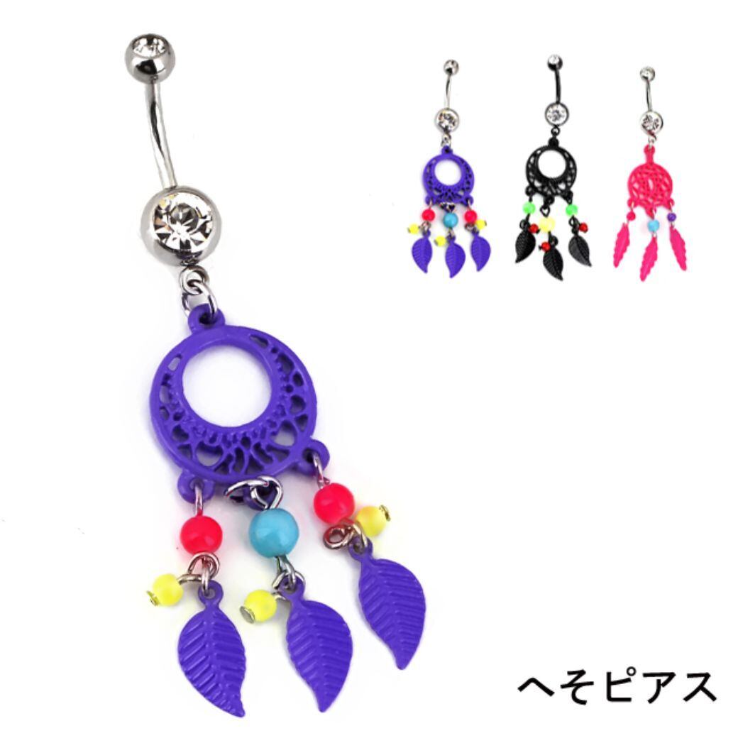 ・POPカラーの可愛いドリームキャッチャーデザインです。デザイン部分が大きく揺れるので目立ちますよ。へそはもちろんロブピアスにもオススメです。