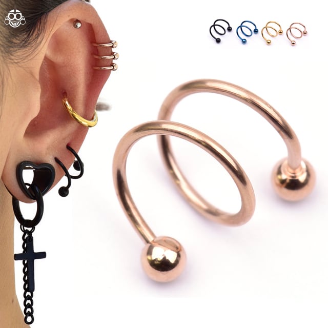 ・通常のスパイラルバーベルよりも1回多くツイストさせたダブルスパイラルピアスです。2つ並んだピアスホールを繋ぐように着けるピアスで個性的でお洒落に決まりますよ!カラーも4色よりお選びいただけます。両側のキャッチが外せるのでお好みのキャッチに付け替えてアレンジも楽しめます。ロブや軟骨、ロック(ルーク)、口ピアスなどにおすすめです。