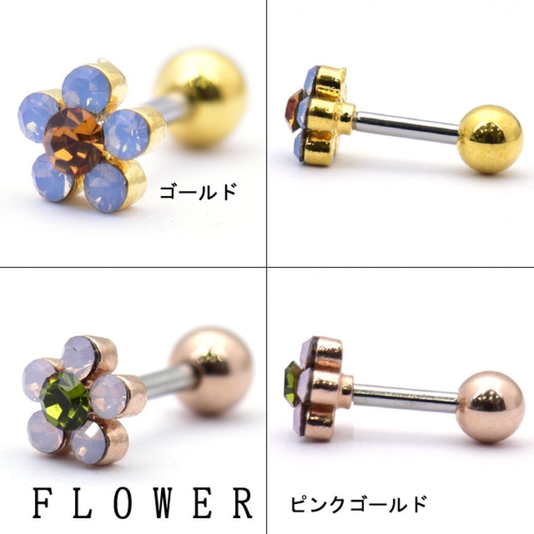 ・乳白色のストーンが可愛らしいお花ピアスです!ゴールドやピンクゴールドカラーが入り華やかですよ。ロブやへリックス・トラガスなどにおすすめですよ。