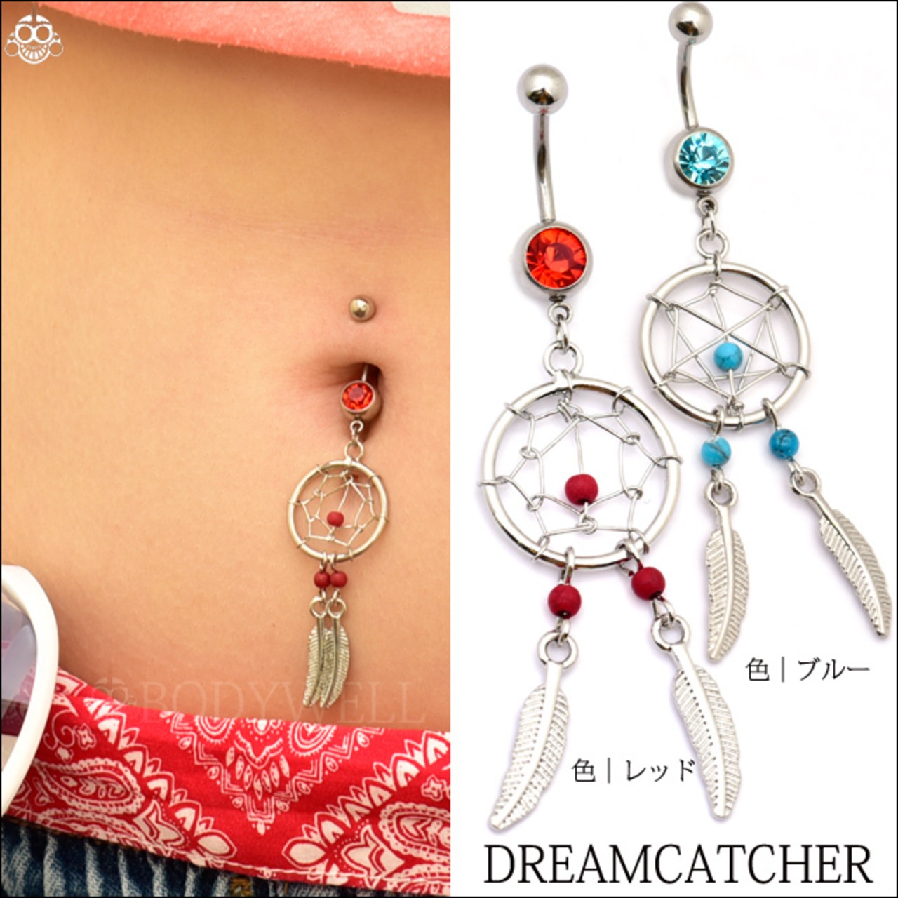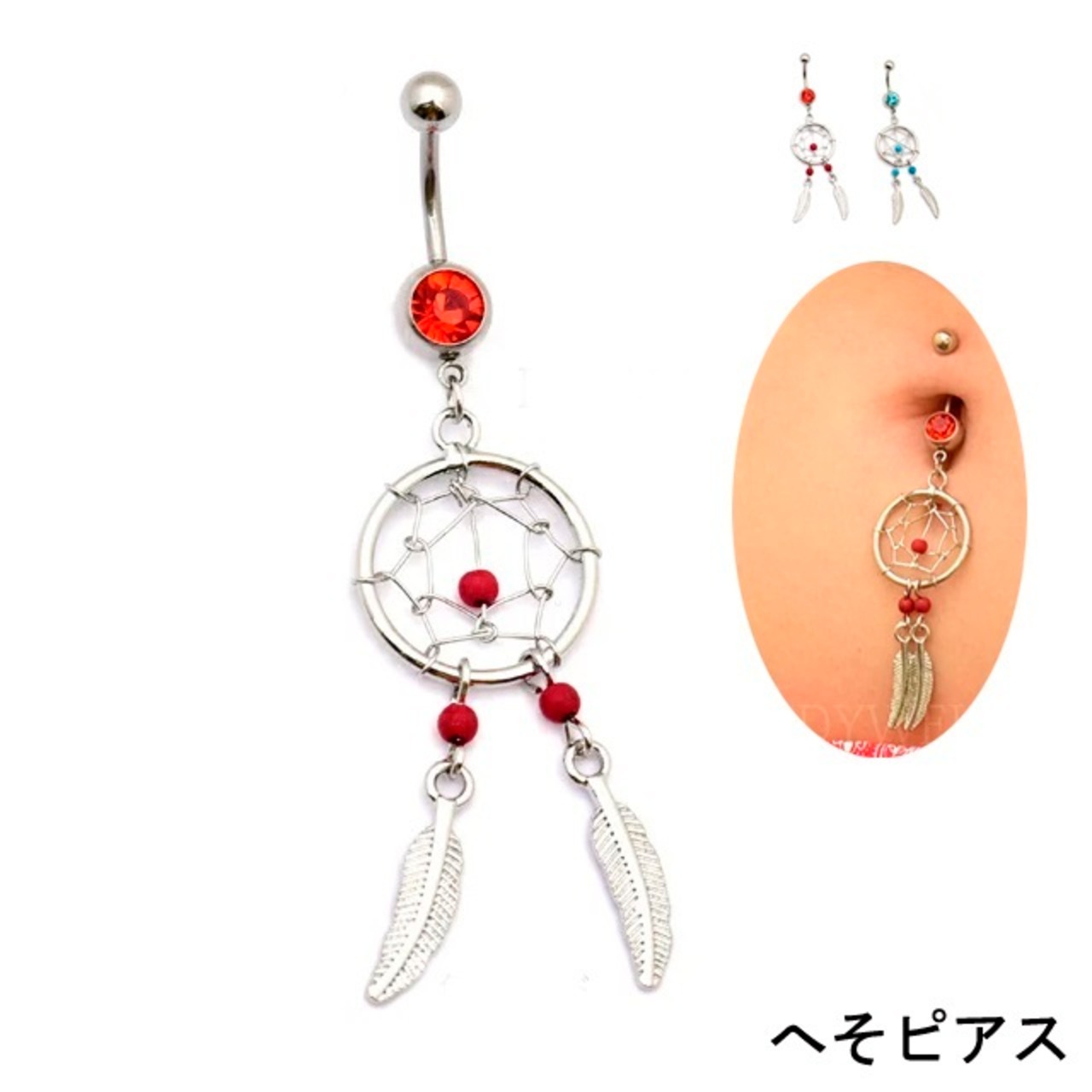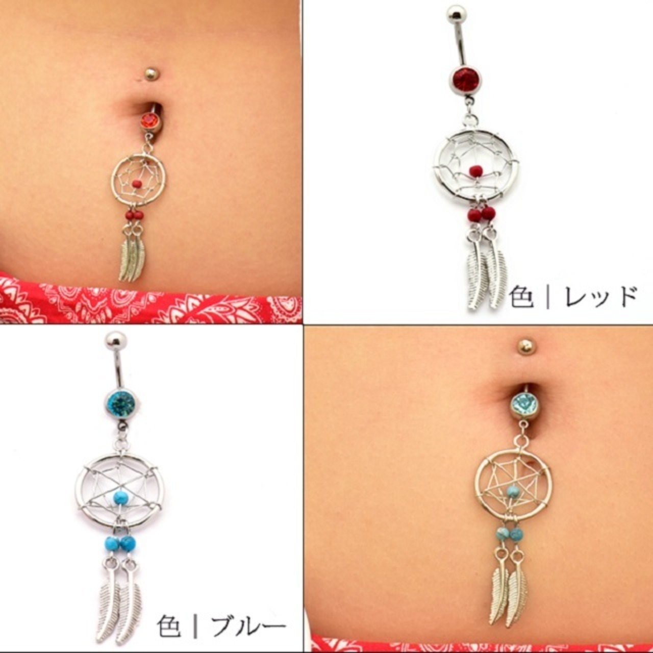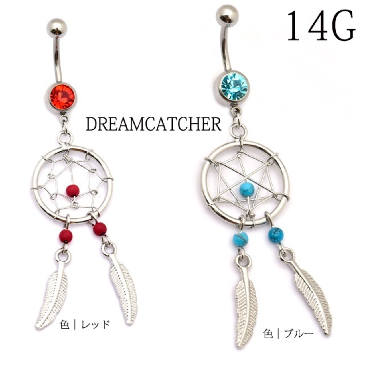へそピアス 14G レッド&ブルー ドリームキャッチャー ボディピアス ステンレスピアス 耳たぶ へそぴ