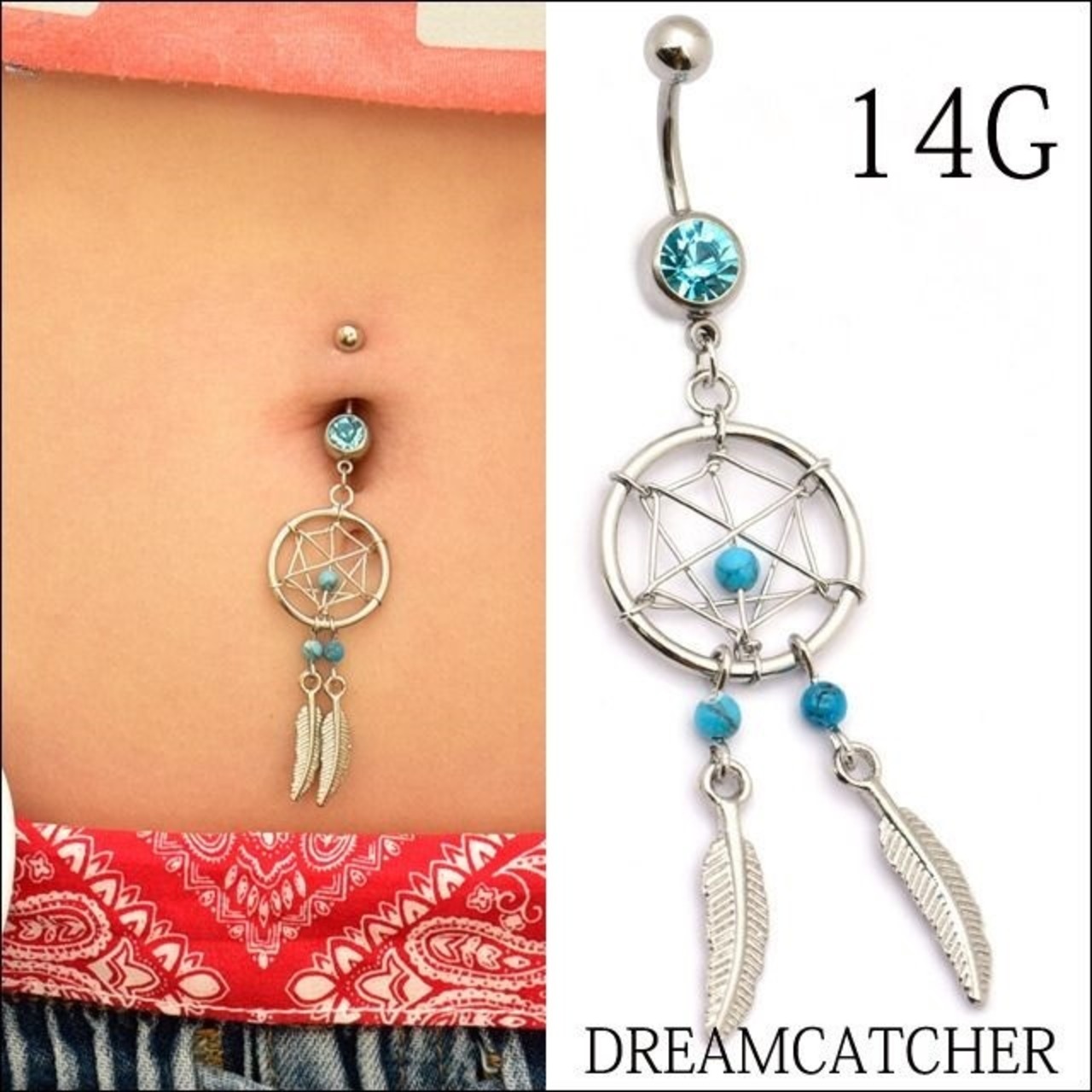 ・可愛いドリームキャッチャーデザインです。デザイン部分が大きく揺れるので目立ちますょ。へそはもちろんロブピアスにもオススメです。