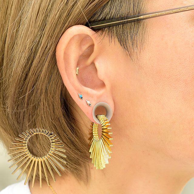 ・SUNRISEデザインで外側に向かってデザインが広がっているので、かなり存在感があります。ホールに入れる部分もデザインが入っていてザラザラしていますがなめらかに施されているので痛くはありません。そのままお使いも頂けます。ホールの大きい方はトンネルピアスにホールトゥーがお勧めです。