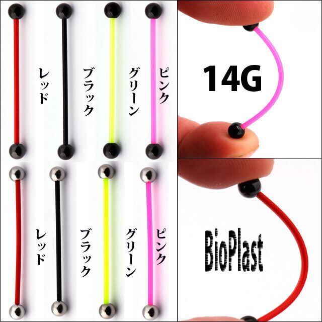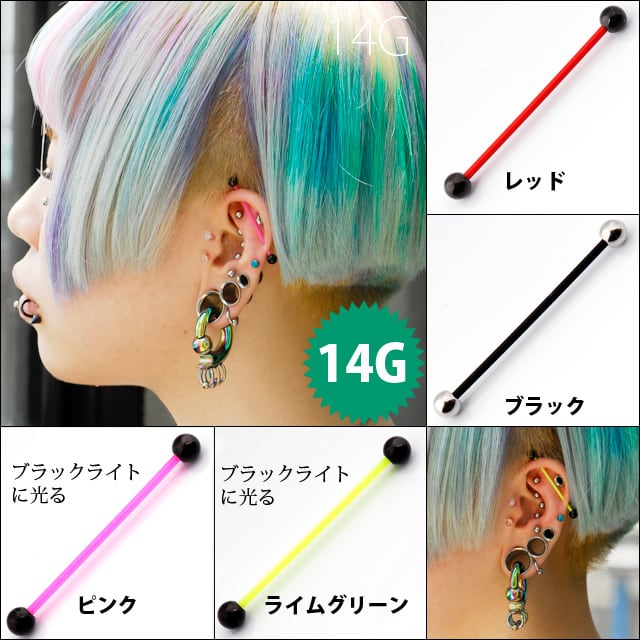 ・ボールも2色から選べ 、イエローとピンクのみブラックライトに光るこの派手ピアスは特殊なプラスチック素材なので柔らかく手で軽く曲げ伸ばし出来ます。曲げ伸ばし出来ると言う事はステンレスと違って硬くなく特に耳に着けるピアスは枕などで圧迫されるとホールが腫れる場合がありますが曲がるピアスは多少柔軟性があるのでホールに優しいと言うわけなんです。もちろん、カラーで気になった方もいるかと思いますが豊富に選べるシャフトサイズがロブ/へリックス(平均6mm)、舌ピアス(平均12mm~16mm)、インダストライアル(平均38mm)等々あらゆる部位に着けれます。※但し表記サイズになく~86mmで選べるサイズを選んだ方は必ずご希望サイズを備考欄や取引きメモ等に必ず明記して下さい。