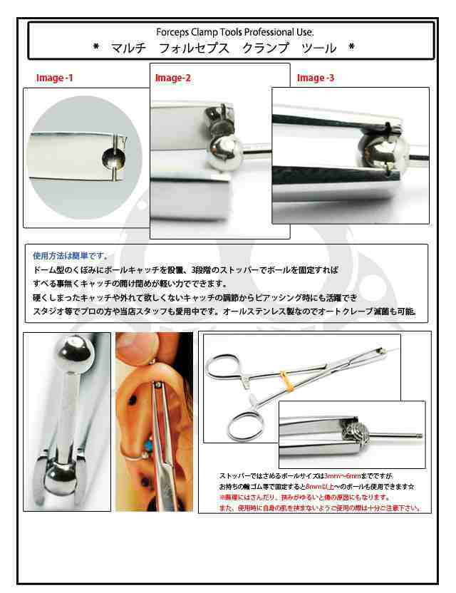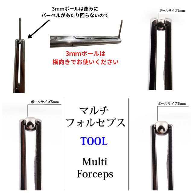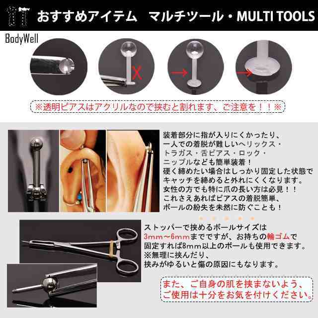 ・プロ愛用ツール! 簡単にボディピアスの付け替えをしたい方!いつもボールが落ちて無くしてしまう方!マルチツールは指が入りにくい部位のつけ替えや留めにくいあの小さいボールも比較的簡単に着けれます。硬くて外せなくなったピアスのキャッチもコレで固定すれば簡単に外すことが可能です。ネイルされている爪の長い方や不器用な方にもオススメです。ストッパー部分が3段階になっており、3mm〜6mmボールまで留めれます。(ボールが小さい場合、横向きで挟んだりでご使用下さい。輪ゴムを固定をすると8mm以上のボールにも使えます。挟む部分には、ドーム型と直線のくぼみがあるのでボールや、フラットディスク、ラブレットやストレートバーベル、さらにマイクロダーマルのキャッチまで挟む事が出来ます。※ストレートバーベルの場合、外れにくくなったボールを外す時は、必ずネジ部分を挟んでください。シャフト部分に挟むと傷が付きます。スタッフの愛用ツールは、当店イチオシアイテムでもあります。