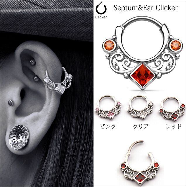 ・セプタム、ロブ、へリックスにオススメのピアスです。クリッカータイプでワンタッチでカッチと簡単に開閉出来ます。人気の3色カラーから選べます。