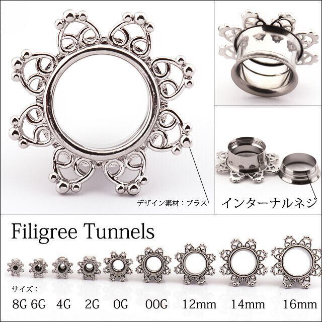 ・フィリグリーデザインがとってもオシャレ♪デザインも細かく身に着けると存在感があって素敵です。インターナルネジタイプでトンネルの形自体もシャープなのでよりデザインが引き立ちます ※耳の装着ピアス画像は14mmです。