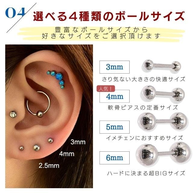 ・定番のストレートバーベルはステンレス素材でファーストピアスにもオススメです。 金属アレルギー反応が起きにくい高品質サージカルステンレス素材を使用でつけっぱなしOK。 シンプルなデザインなので、コーデにも合わせやすくロブや軟骨ピアス、舌ピアス等色んな部位に使えます。 長さも専門店ならではのレアサイズもあるので今までブカブカしていた方もレアサイズなら引っかかりにくく安心してご利用頂けます。 両側キャッチが外れるので、同じネジ式のキャッチやチャームでカスタム可能。 自分だけのオリジナルのボディピアスが作れます。 シンプルなのでいろんな部位に着けれます。 イヤーロブ・ヘリックス・アンチトラガス・アウターコンク・インナーコンク・ラブレット(口ピアス)・リップ(口ピアス)・マドンナ・チーク・センタータン・タンリム・タンエッジ