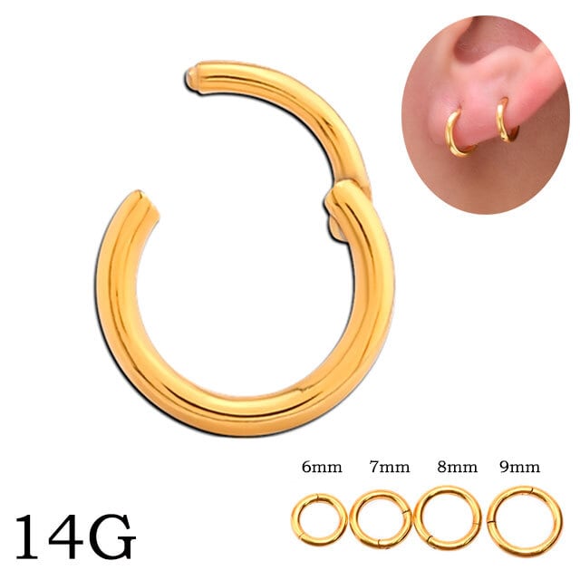 ・高級感あるゴールドピアスです!24金ゴールドのコーティングで輝きがとても綺麗です。道具なしでも簡単に着けれるセグメントリングピアス!シンプルだから人気あるけど硬そう、道具も要るからと敬遠されていましたがコレならカチッと手で開いたり閉じたり出来るのでストレスなく使用出来ます。内径サイズも豊富に選べるのでシンプルな形もロブ、へリックス、セプタム、リップ、タンリム、ニップル、へそピアス等々いろんな部位に装着できるので重宝しそうです。※こちらの商品は、ステンレスに24金ゴールドコーティングをしております。 ※在庫切れの場合、次回入荷までにお時間がかかる商品になります。