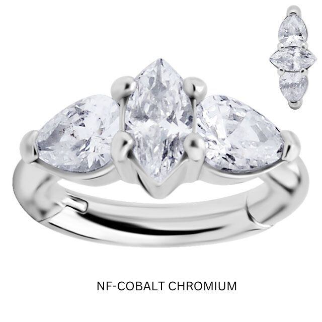 ・リングは丸ではなく楕円形になります。楕円形なので着ける部位によって出っ張らずフィットしてくれます。 キラキラ輝くジルコニアは、プレミアムジルコニアなのでダイヤモンドと同じような輝きを持ち、とても綺麗です。素材はホワイトゴールドやプラチナなどの貴金属に似た魅力的な白色と輝きを持つコバルトクロム合金で高い耐食性と驚くべき強度があり滑らかで光沢があるニッケルフリー(ノンニッケル)で金属アレルギー対応のリングピアスです。ニッケルフリーとは金属アレルギーを引き起こしやすいニッケル素材を含まずに作られている素材です。またワンタッチで着脱簡単な一体型ボディピアスなのでキャッチを失くす心配もありません。 つけっぱなしOKで耳たぶ へそピアス へリックス ダイス ロック 軟骨ピアス等にオススメです。