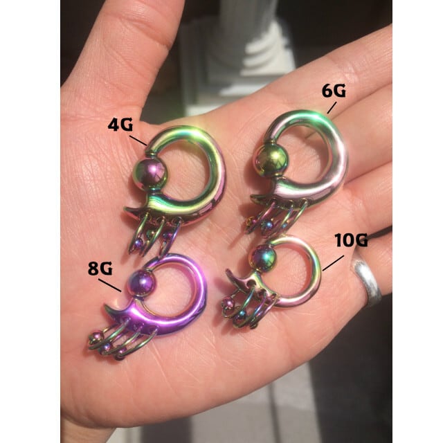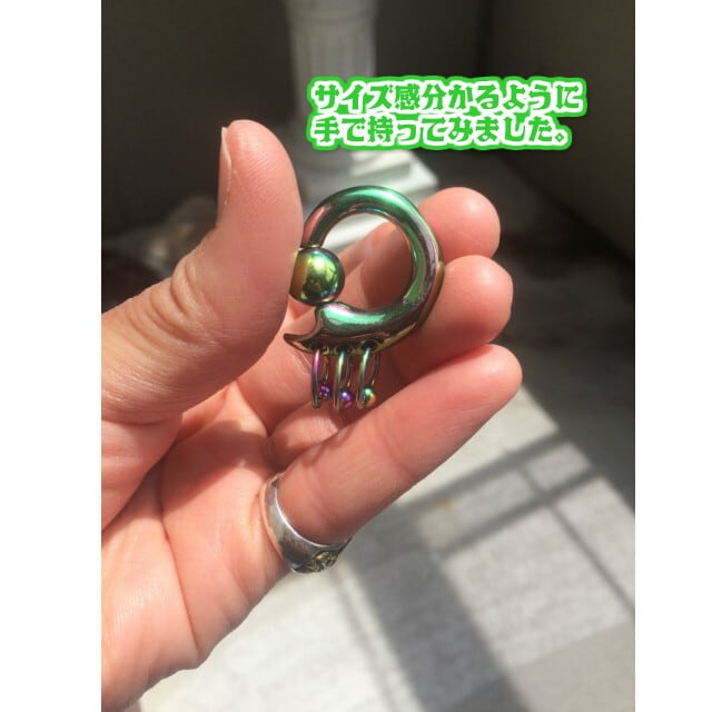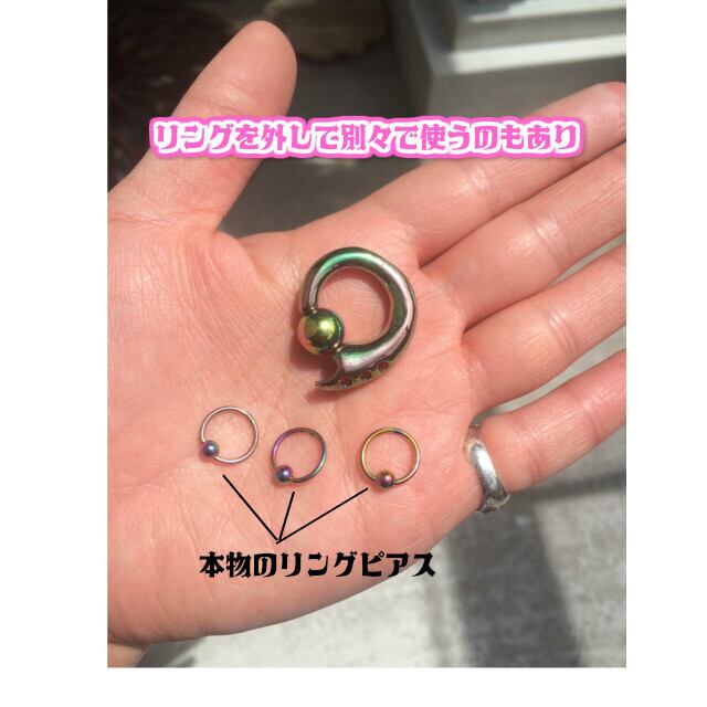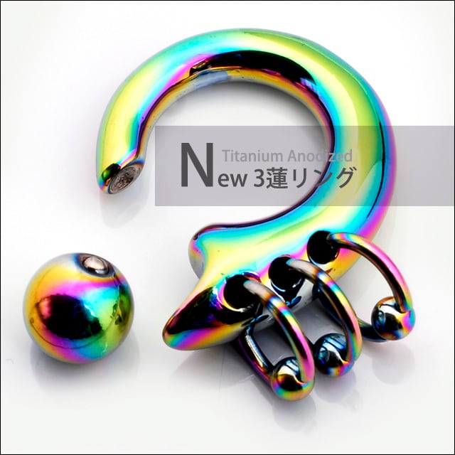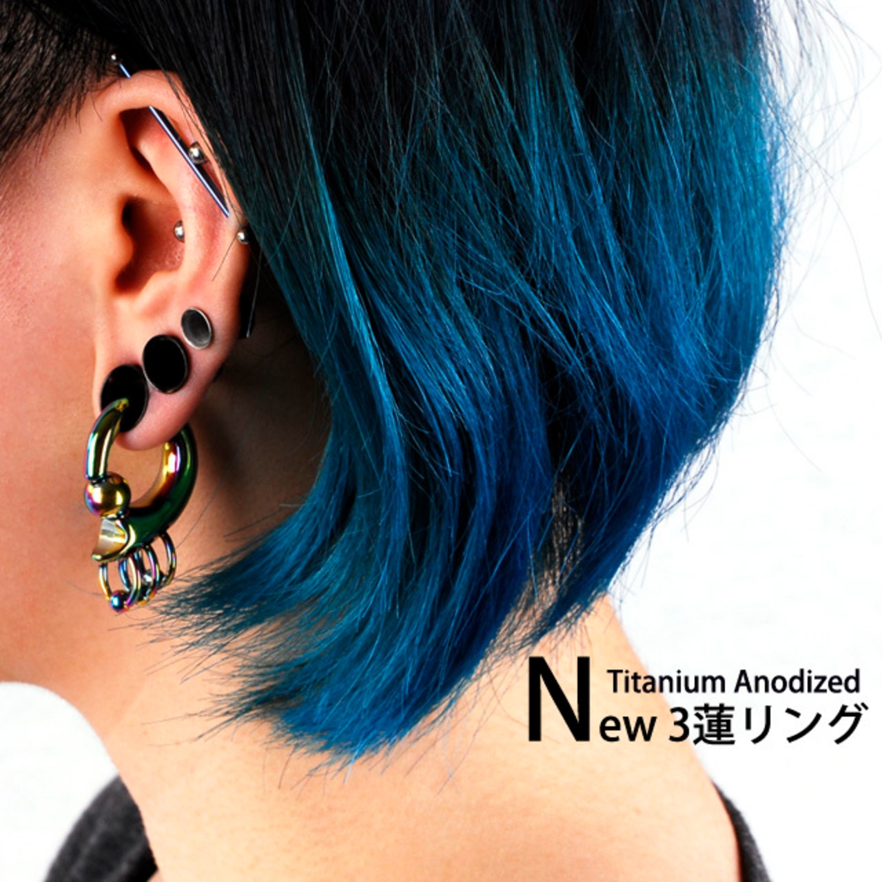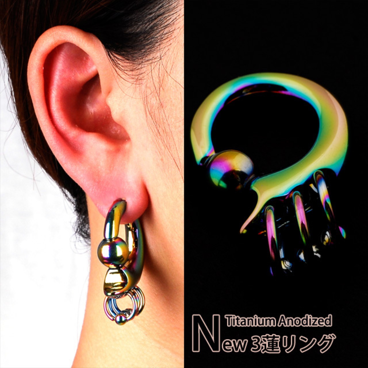 ・3つのリングが連なってかっこいい仕上がりになっていますが3つのリングも本物のピアスなので外して使ったり、自分で違うピアスを付けてカスタマイズもオススメです♪チタンカラーは、めったに入荷しないので貴重ですょ。キレイなレインボーカラーなのでイメチェンにもオススメ。ボールはスプリングタイプなので着脱が簡単です。※リングの内側に1ミリ程度のコーティングされていない箇所がございます、コーティング過程で引っ掛けてコーティングする為、一部分のみコーティングされません。あらかじめご了承下さい。 ※装着画像は4Gを使用しております、小さいゲージは全体的に画像よりも小さいのでイメージとしてご確認ください。