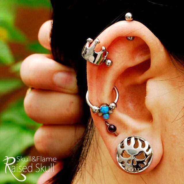 ・カッコイイスカルデザインのハイポリッシュトンネル★ 燃えるスカルがクールに決めてくれます。ハイポリッシュで磨きがとっても綺麗なトンネルの仕上がりです♪ インターナルダブルフレアタイプは、ホールを大きく、綺麗に見せるトンネルです。