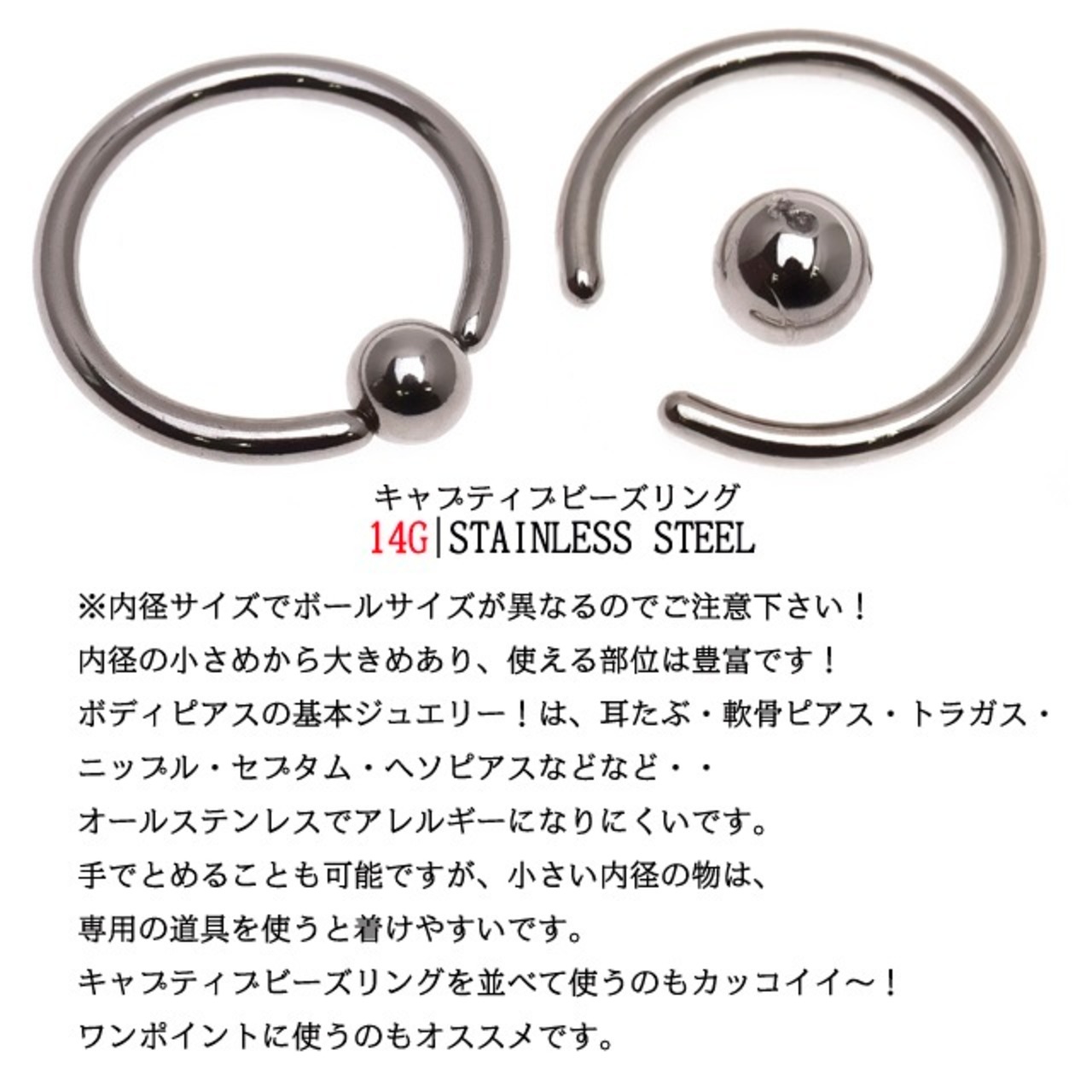 ・内径の小さめから大きめあり、使える場所はも沢山!ボディピアスの基本ジュエリー! 耳たぶ・軟骨ピアス・トラガス・ニップル・セプタム・ヘソピアスなどなど・・ オールステンレスでアレルギーになりにくいです。手でとめることも可能ですが、小さい内径の物は、プライヤーを使うと簡単に付けられます。 キャプティブビーズリングを並べて使うのもカッコイイ!ワンポイントに使うのもありです!