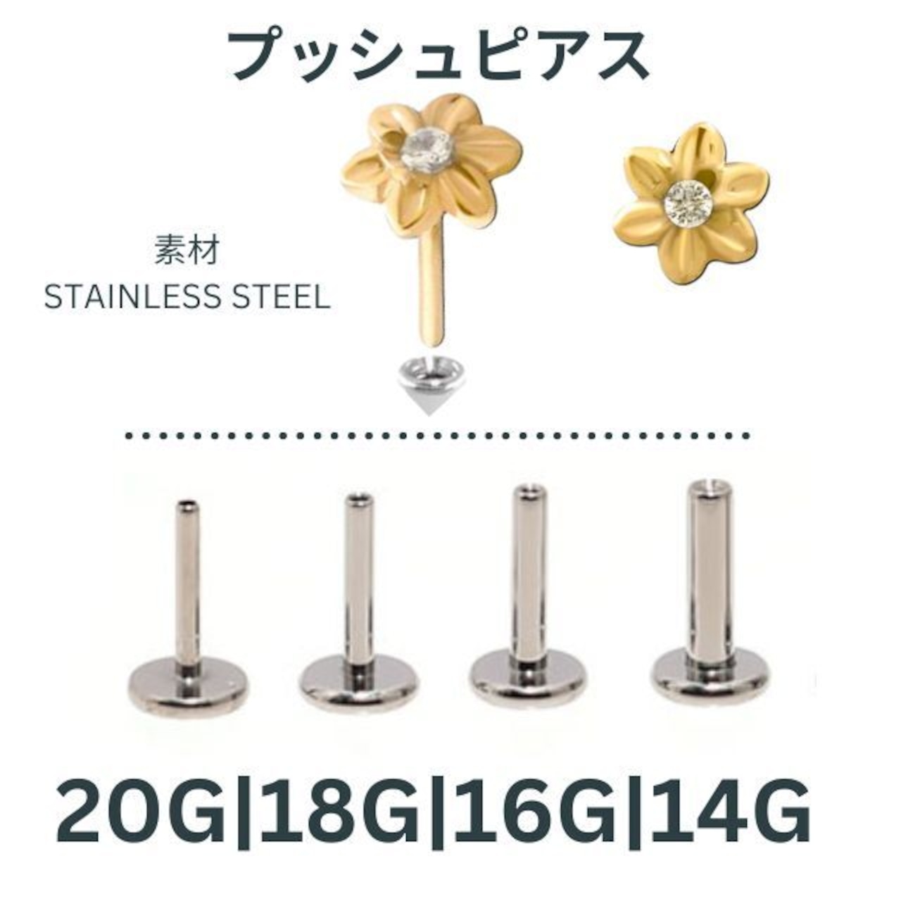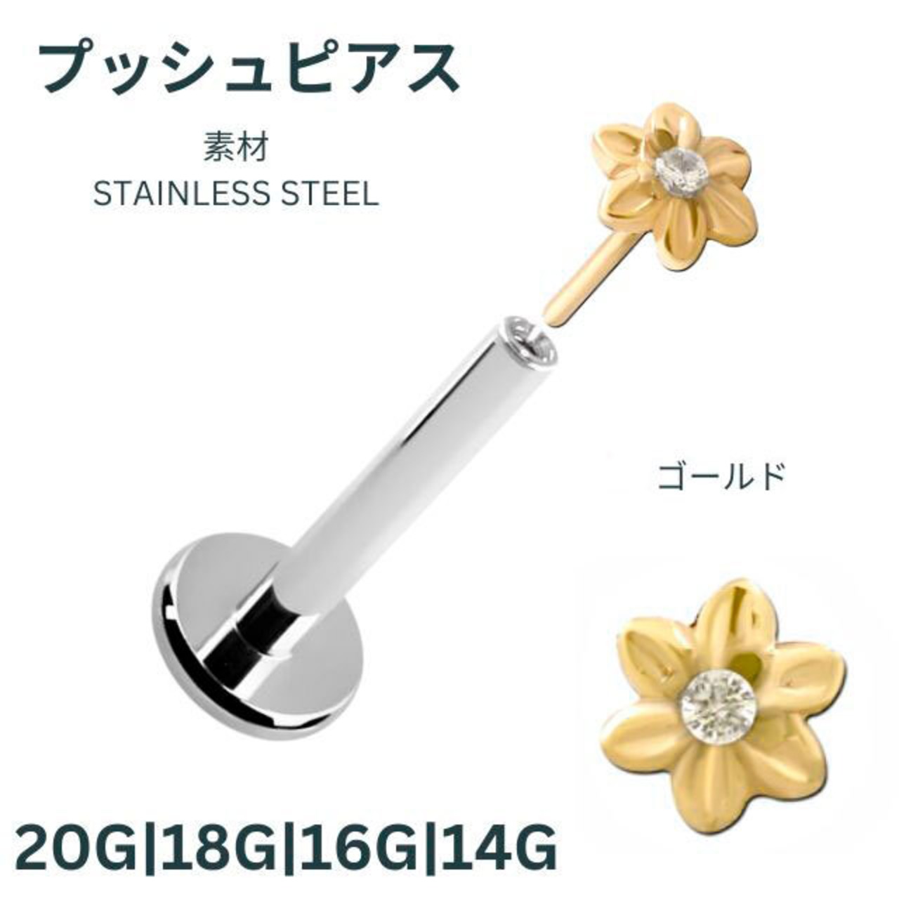 ・人気モチーフのお花デザインは小ぶりでとってもキュート。真ん中にはジルコニアがあるので輝きがあり小さくてもさりげなく存在感があります。バーベル部分は、医療用タイタニアム(チタン)なのでお肌に優しく相当なアレルギーでない限り安心してお使い頂けます。何と言っても装着が挿すだけの簡単プッシュピンタイプなのでネイルされている方や不器用な方にもオススメです。※たまにキャッチが緩くなったら画像のように調節して下さい。※キャッチは専用のプッシュピアスなら20G/18G/16G/14Gどれにもはまります、着ける部位でゲージサイズが異なるときは着けたいサイズのラブレットがあれば使えます。 ※ラブレットの下のフラットなディスク部分は入荷時期によりサイズが異なります予めご了承ください。