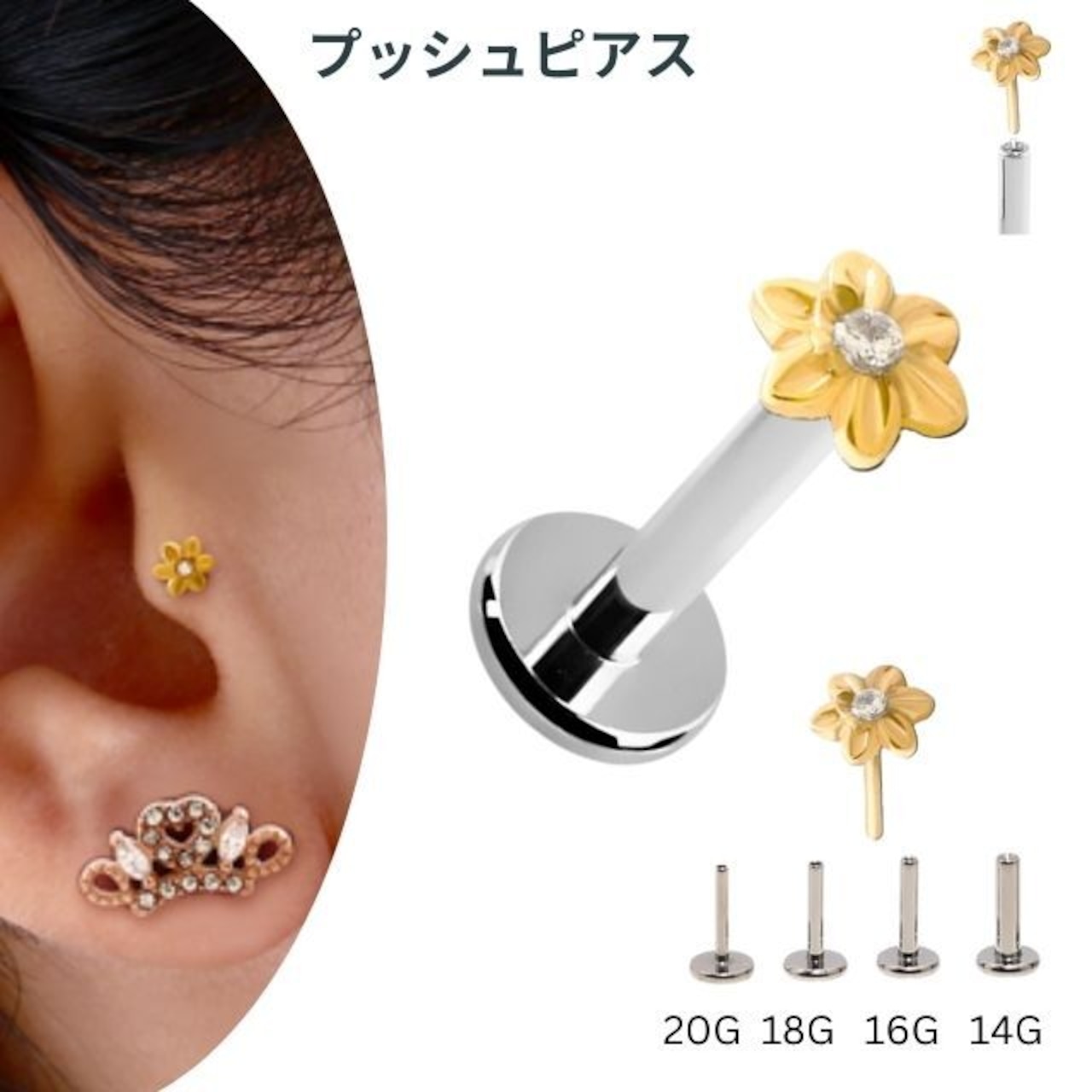 プッシュピアス 20G 18G 16G 14G ゴールド MINI フラワー ラブレットスタッド 金属アレルギー対応 チタンピアス つけっぱなし 軟骨ピアス ボディピアス