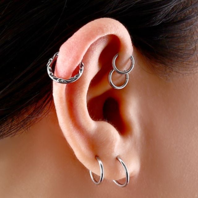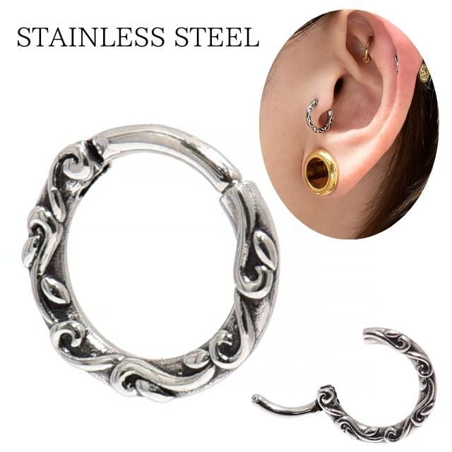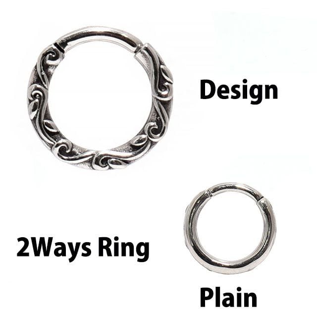 ・片側にがフィリグリーデザインが入り、もう片面はプレーンのデザインなしなので気分で向きを変えてご使用いただけます。2パターンで楽しめる2WAYリングピアスです。しかもワンタッチで開閉できるのでストレスなくお使いいただけます。内径サイズも小さすぎず大きすぎず使いやすく、つけっぱなしOKでロブ へリックス トラガス 軟骨ピアス セプタム等にオススメです。