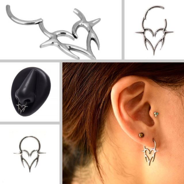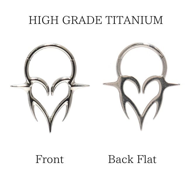・thorns Heartデザインでハートにトゲありデザインがハードで、ハートデザインですがかっこよく決まります。 ワンタッチでカチッと簡単に開閉できるので着けにくい部位にもストレスなくお使いいただけます。 素材は、医療用タイタニアム(チタン)で、丈夫で軽く相当なアレルギーでない限り金属アレルギーの方でも安心してお使い頂けます。 つけっぱなしOKでロブ へリックス 軟骨ピアス セプタム等にオススメです。
