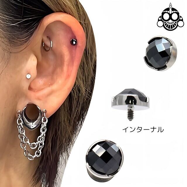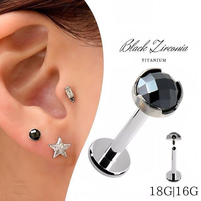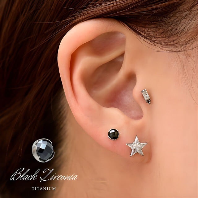 ・ブラックジルコニアがCOOLでかっこいいです。中央に向かって高さをつけながら三角形のカット面が組み合わさった、ローズカット仕上げなので、ブラックストーンでも輝きがとても綺麗です。つけっぱなしOKでロブ へリックス トラガス インナーコンク アウターコンク 軟骨ピアス等にオススメです。台座とバーベルは医療用タイタニアム(チタン)で、お肌に優しく相当なアレルギーでない限り安心してお使い頂けます。 ※別売りのツールがあると不器用な方でも、入れにくい部位でもスムーズにホールに入りオススメです。