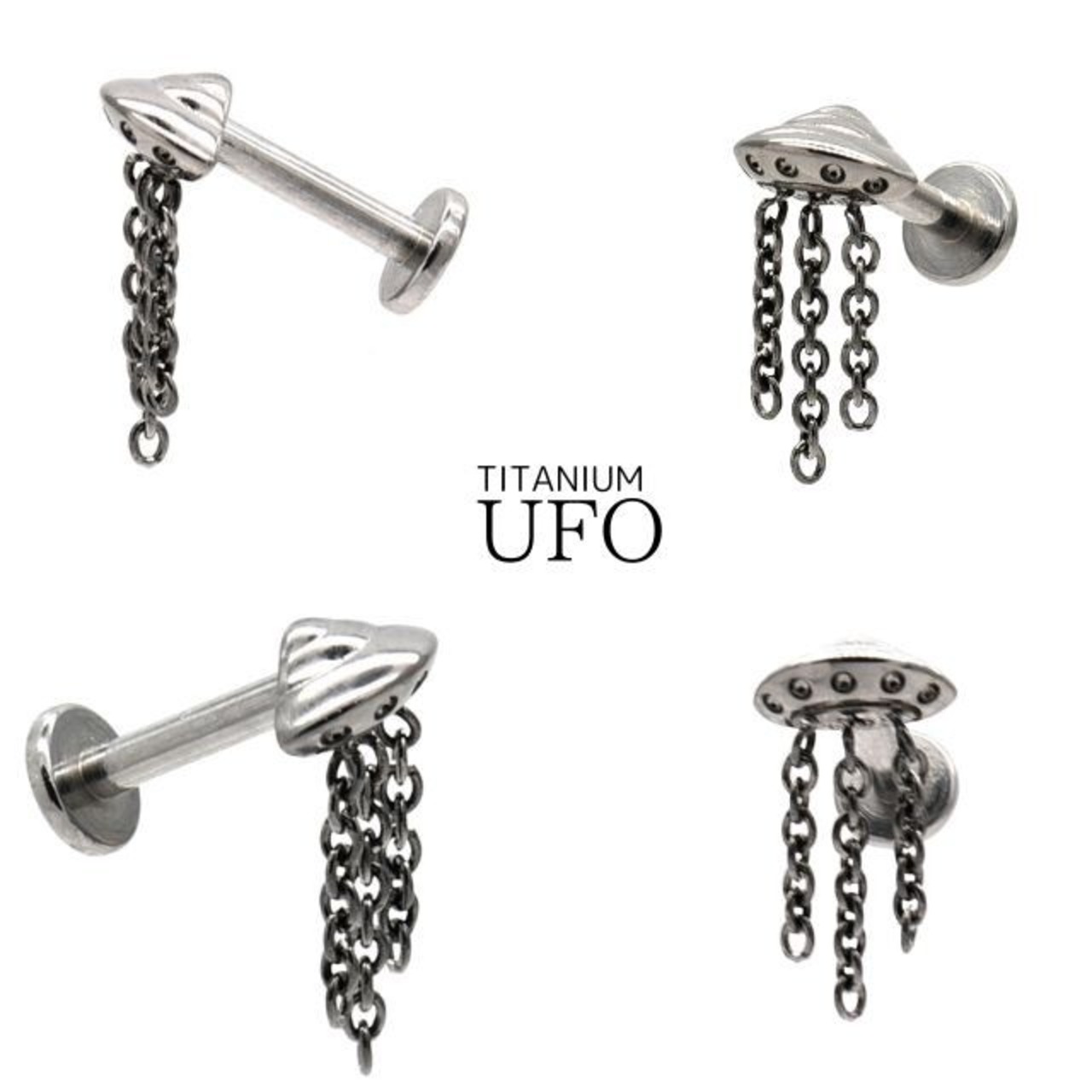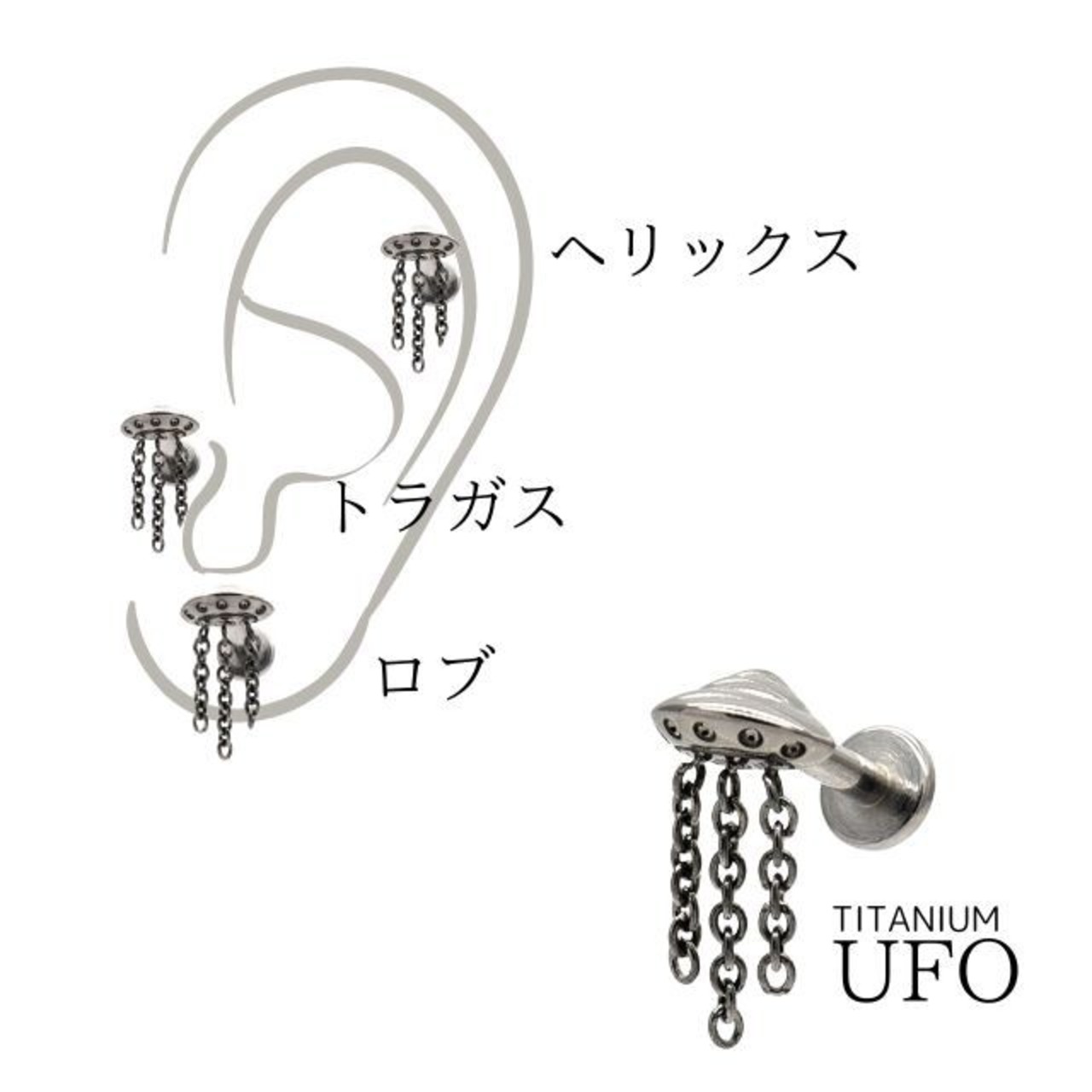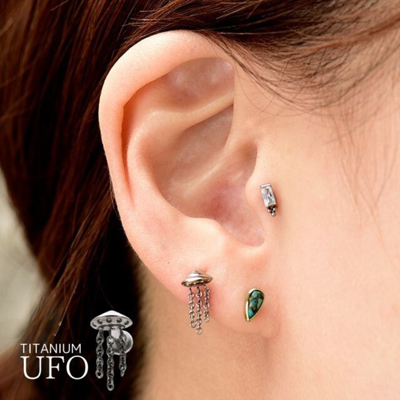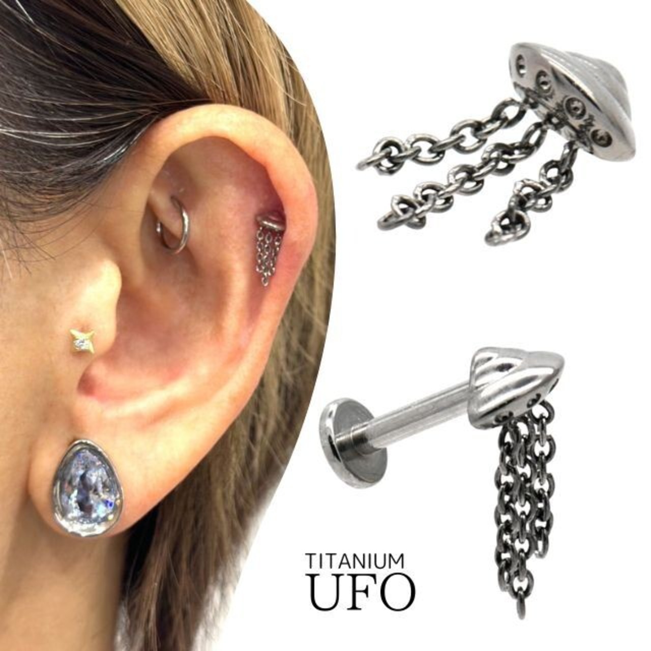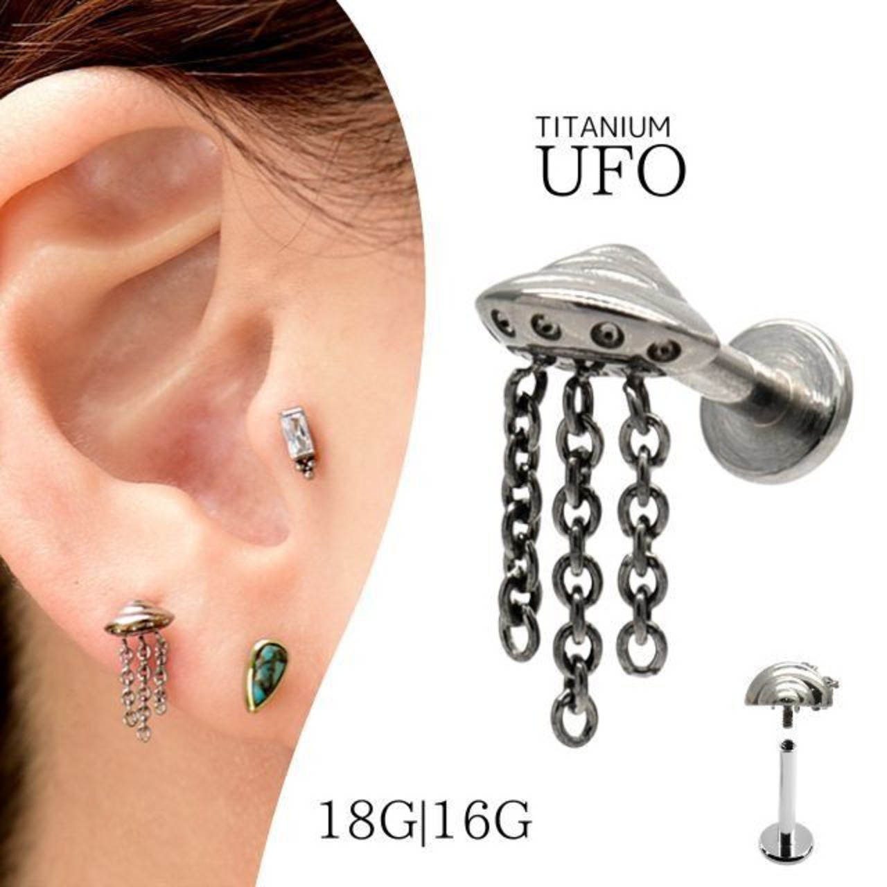 ・UFOデザインがとってもキュート!個性的に決まります。立体的なので横から見た時も存在感があって揺れるチェーンがアクセントになってオススメです。つけっぱなしOKでロブ へリックス トラガス インナーコンク アウターコンク 軟骨ピアス等にオススメです。台座とバーベルは医療用タイタニアム(チタン)で、お肌に優しく相当なアレルギーでない限り安心してお使い頂けます。 ※別売りのツールがあると不器用な方でも、入れにくい部位でもスムーズにホールに入りオススメです。