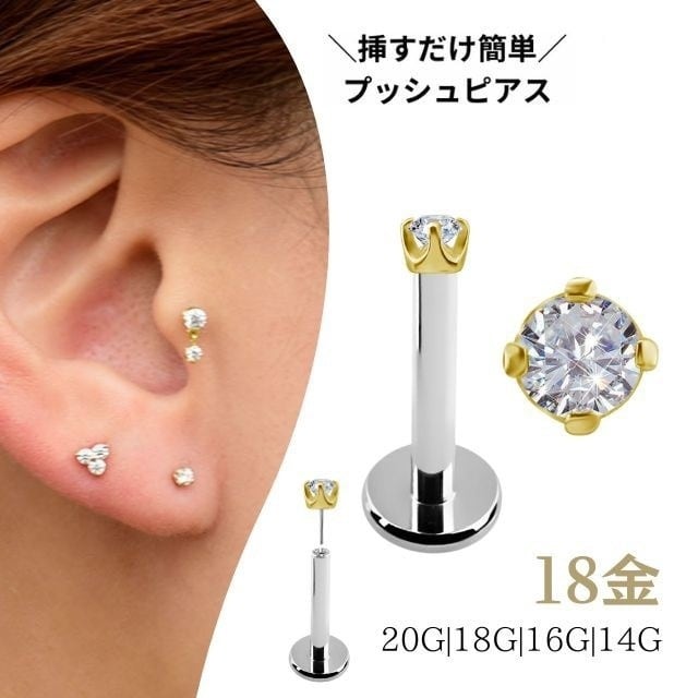 18金 ピアス 2mm 立爪 ダイヤモンド プッシュピアス 20G 18G 16G 14G 18Kゴールド チタンピアス 金属アレルギー対応 ラブレットスタッド ボディピアス 軟骨ピアス | BONshape ボディピアス専門店