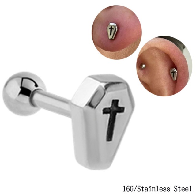 ボディピアス 16G 十字架 棺桶 Coffin 2サイズ ストレートバーベル 軟骨ピアス ロブピアス ヘリックス ステンレスピアス【ハロウィン】